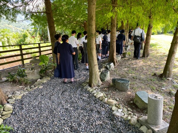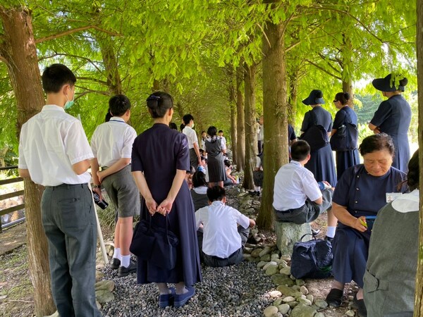 再接著參觀「落雨松步道」,常住師父:看看地上的碎石子,走在碎石子路上想到「前人鋪路的辛勞」,要懂得感恩,「尊師重道」,要敬重老師,感恩老師的教導!