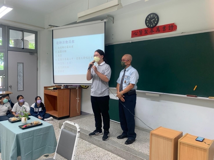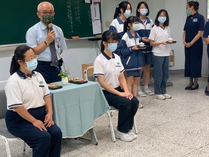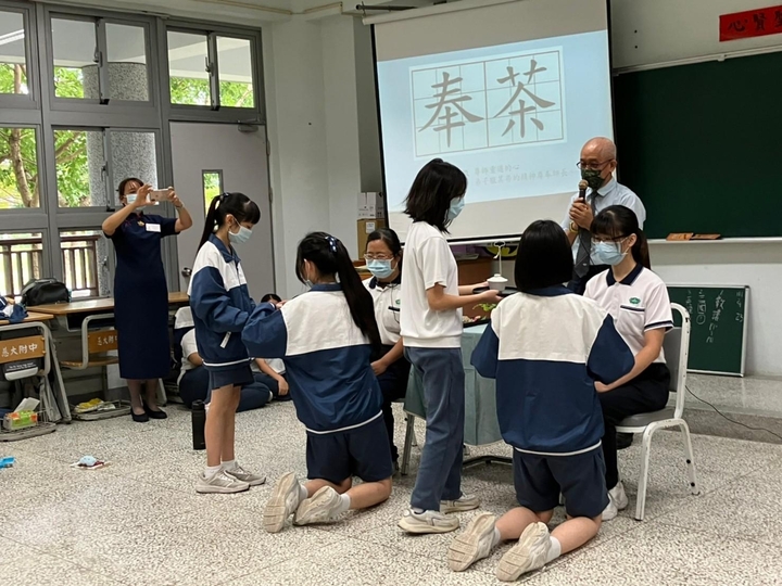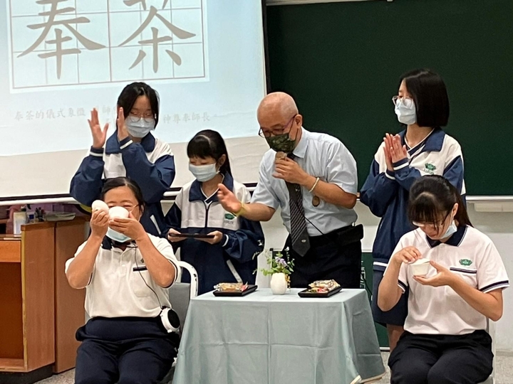 4位同學2人一組奉茶,在感恩尊重愛的音樂中,孩子們自動以跪姿奉茶,代表心中的愛與感恩,恭敬奉上三好茶,第一口茶「祝老師身體健康」、第二口茶「祝老師心想事成」、第三口茶 「祝老師平安吉祥」,場面溫馨感人。