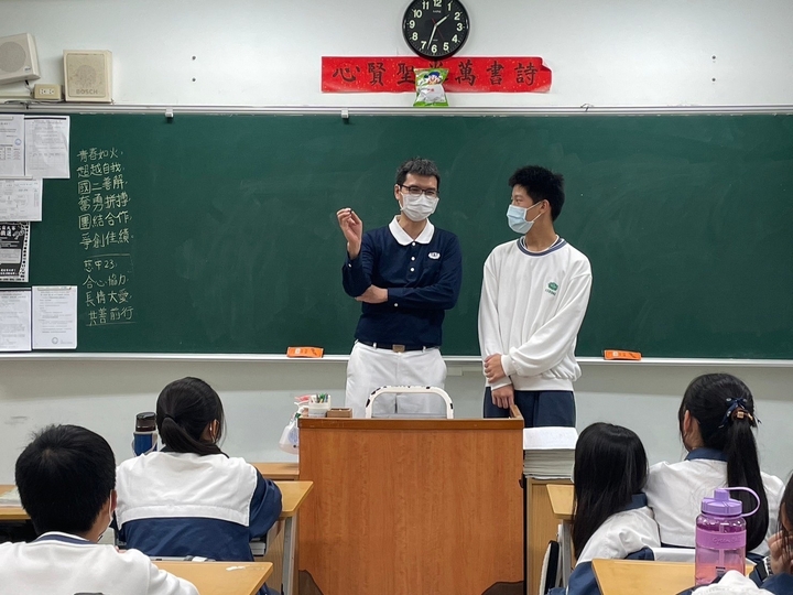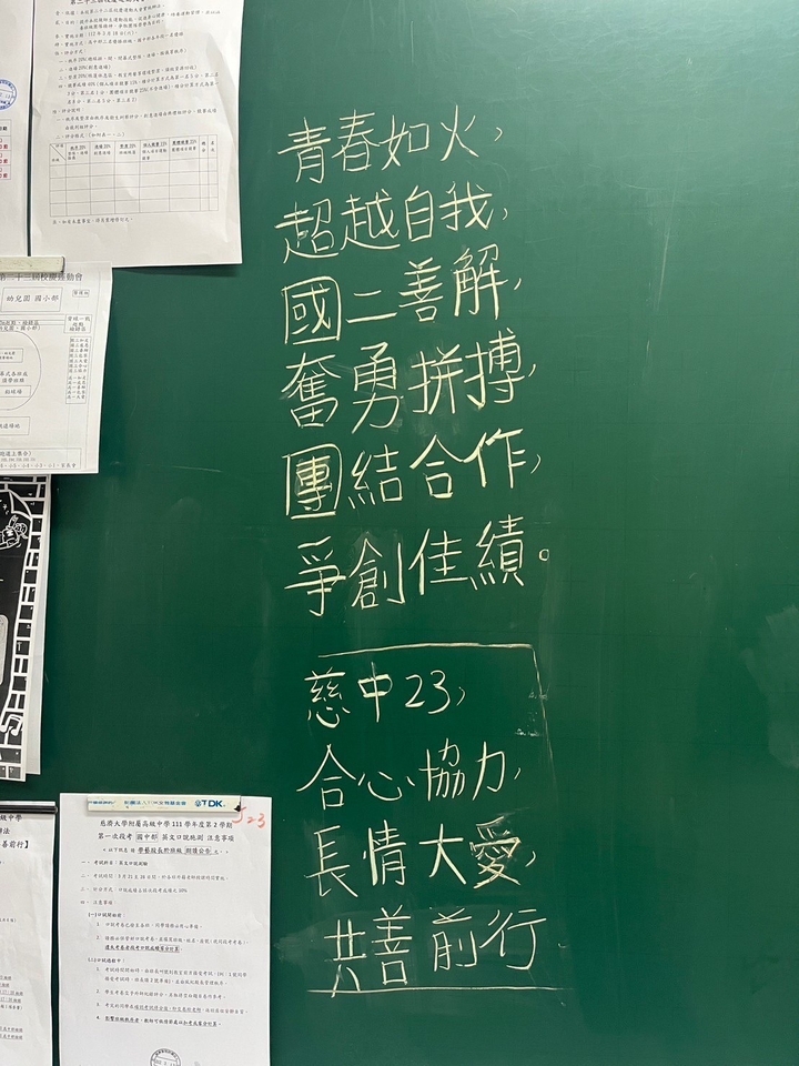 下午進班家聚時,懿德爸媽準備好吃的香椿餅,並陪伴班長及幹部代表上台練習運動會的進場口號:「慈中23,合心協力,長情大愛,共善前行,青春如火,超越自我,國二善解,奮勇拚搏,團結合作,爭創佳績」。孩子們用心的練習,很開心也很有精神。