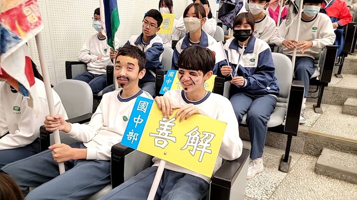 隔天因為下了一夜的雨,操場濕漉漉的,慈懿會爸媽們在妙善廳一起虔誠祈禱不再下雨天氣能放晴,但是奈何花蓮的天氣有如少女心,說下雨就下雨⋯運動員進場就改至演藝廳舉行,國一善解班的合作國際學校是日本,我們班的男孩就打扮成日本大男人模樣進場,樣子還挺好玩的!其他人臉頰也都畫上日本的國徽很是有趣!