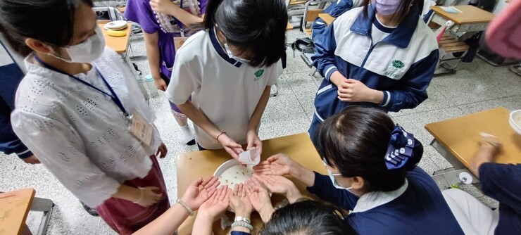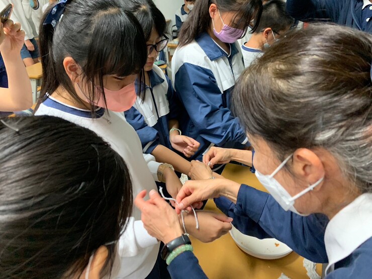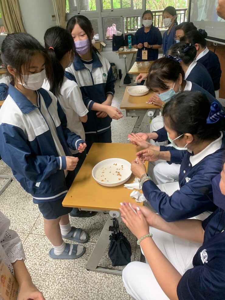 吃完冰淇淋潤餅,換泰北的學生介紹潑水節的由來;潑水節4/15日,長輩坐著由晚輩倒花香水幫長輩淨手,淨手完的長輩用晚輩遞上來的手巾擦手後,再取一條白繩繫在晚輩的手腕、拍拍晚輩肩膀以示祝福。今天的潑水節活動由泰北的3位孩子幫忙取水協助本班的孩子幫懿德爸媽淨手,完畢爸媽幫本班的熊孩子系上白繩祝福他們平安順遂長大、越來越穩重🙏