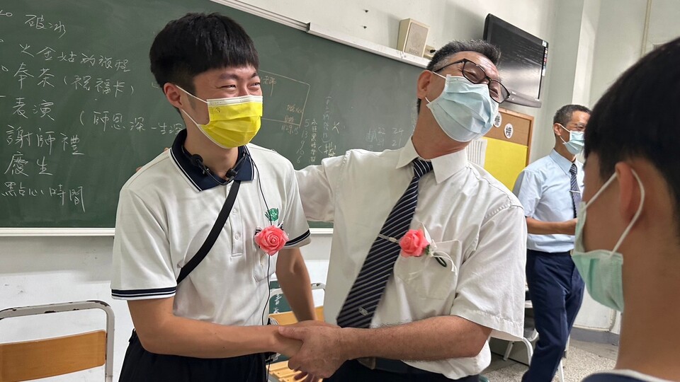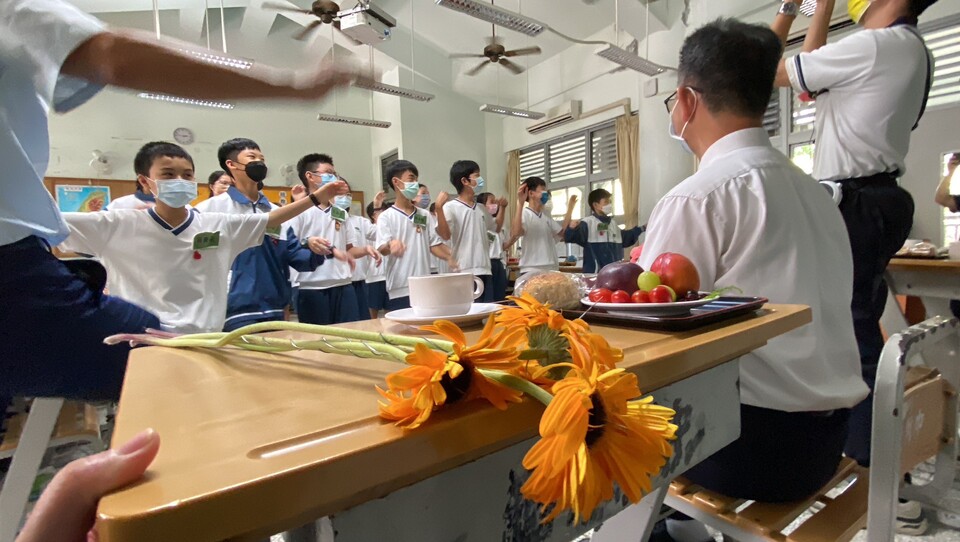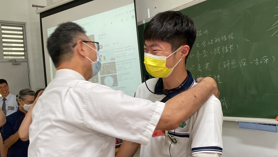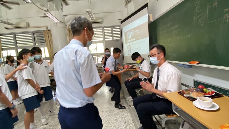 孩子請老師入座奉茶食。從如規如儀的奉茶過程孩子們更加深了一份對老師的感恩尊重愛。接著孩子們羞澀的唱跳著律動,在那氛圍中的感動孩子們用力唱出了對老師的謝謝與感恩。最後也鼓勵孩子們給老師來個愛的擁抱,在互動中青春期羞澀的孩子們,為避免過多的身體接觸,所以也主動伸出手跟老師握握手🤝謝師恩,同為男同事的簦瀚老師也主動跟陳銘老師來一個擁抱彼此祝福勉勵。