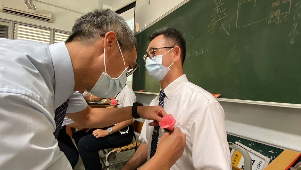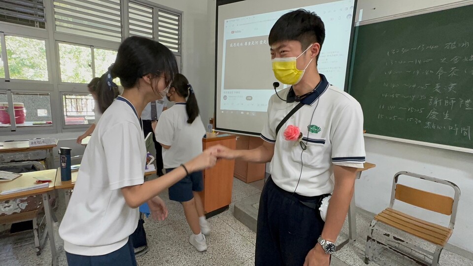 班長邀請老師進入教室孩子們也一一列隊送上花朵迎接老師。