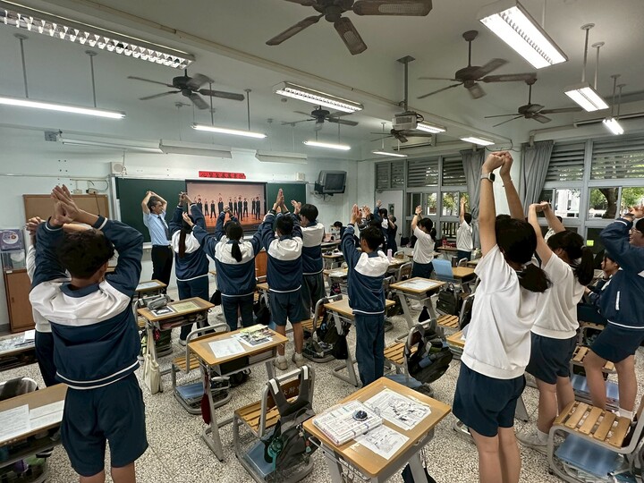 活動一開始,由活力滿滿的志強爸帶來「傳法健身德行品梵唄第七段(勇健操)—大哉大悟大聖主」,作為暖場破冰。伴隨著節奏分明的音樂與肢體律動,全班同學一起跟著動起來,既伸展了筋骨,也活絡了氣氛。志強爸以幽默又充滿能量的方式引導每一個動作,讓大家邊笑邊動作,不但喚醒了午休後的精神,也讓整場活動一開始就充滿了歡樂與凝聚力。健身操中蘊含的正向意涵,也提醒大家:身心健康與智慧成長是一體兩面,缺一不可。