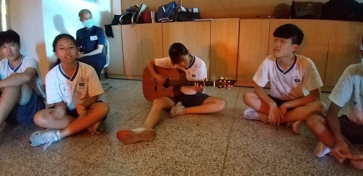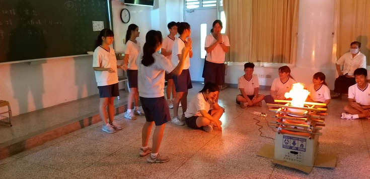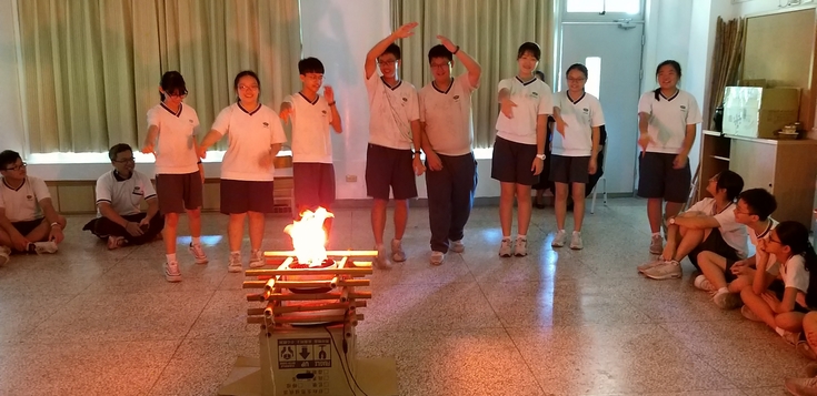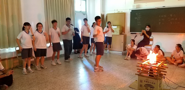 驚喜、驚喜、真的令人驚喜!沒想到在班導 秉忠老師的引領之下,帶動孩子們自己規劃一場在教室內的營火聚會,用簡易的竹竿搭起造型火爐,在其中放入一個可折式向上吹的風扇,再加上一個燈泡、幾條紅色的綵帶,並將教室內的課桌椅暫時往外移、也將教室內的窗簾拉起來,剎那之間!著實營造出一股感恩營火晚會的氛圍。