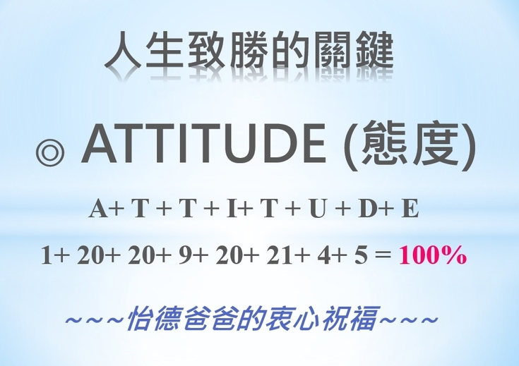 在西方的英文字母中,蘊藏著與數字相關聯的金鑰密碼,若是以A代表1、B代表2……一直到Z代表26的話,那麼「態度ATTITUDE」這一英文字母的數字加總,竟會是A-1+ T-20+ T-20+ I-9+ T-20+ U-21+ D-4+ E-5 = 100%。這神奇的英文字母與數字關聯的背後意涵,不就正是告訴我們,人生做事成功的致勝關鍵,就是要先具備這一份100分的「態度ATTITUDE」嗎?在最後的營火聚會結束前,怡德爸爸代表大家,用以下的幾句靜思語來祝福國三協力班的所有孩子們,用正確的態度來邁向自己下一階段的讀書學習與人生挑戰。