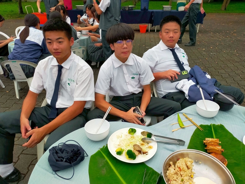 傍晚在福慧廣場舉行的餐會,涼風徐徐 月光相伴,邊吃著以鮮綠的香蕉葉當襯底呈裝各式色香味俱全的餐點,邊欣賞孩子們精彩的才藝演出,個個能歌善舞,還有武術表演,耍刀弄槍甩棍無所不行,令人看得目不暇給,叫好聲連連。