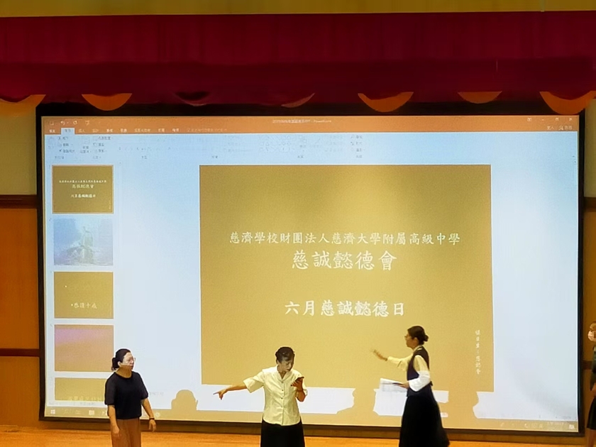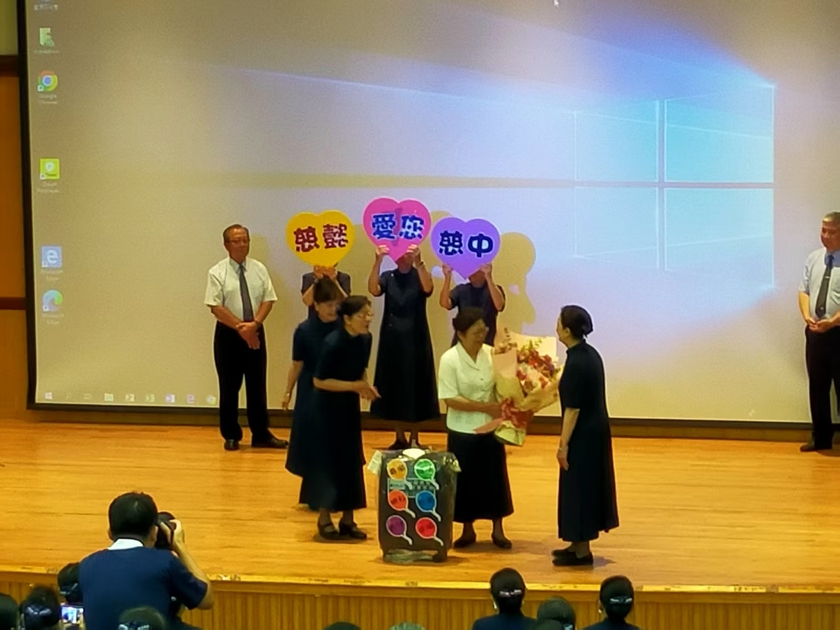 今天是本學期最後一次慈懿日,也是國三高三孩子們的畢業典禮,更是慈中大家長李玲惠校長在任最後一次和慈懿爸媽相聚的日子。慈懿會特別為玲惠校長在慈中八年來的日常策劃了一齣情境劇,由一群素人慈懿爸媽擔綱演出,其中飾演校長的蘇于芳師姊精準抓住校長神韻,將其扮演得維妙維肖,生動活潑的演出令人不禁莞爾,博得不少掌聲與喝采。
