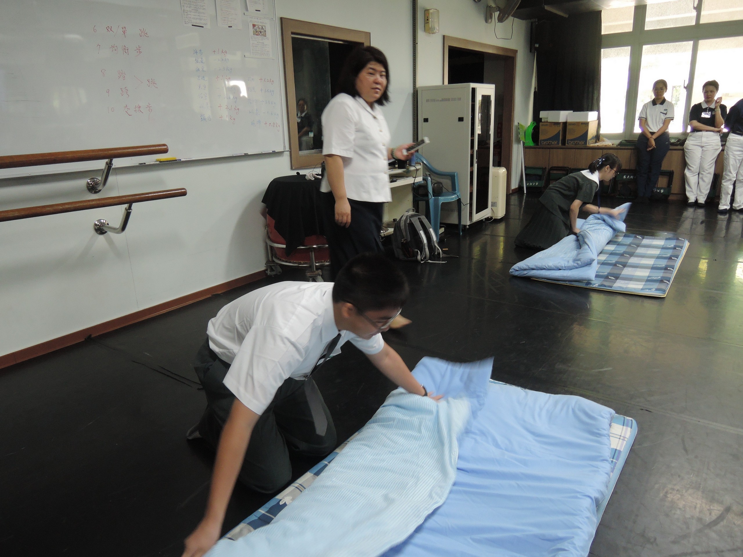「住人為本」,關主說得詳細,孩子們用心學習,如何摺被,整理背包。