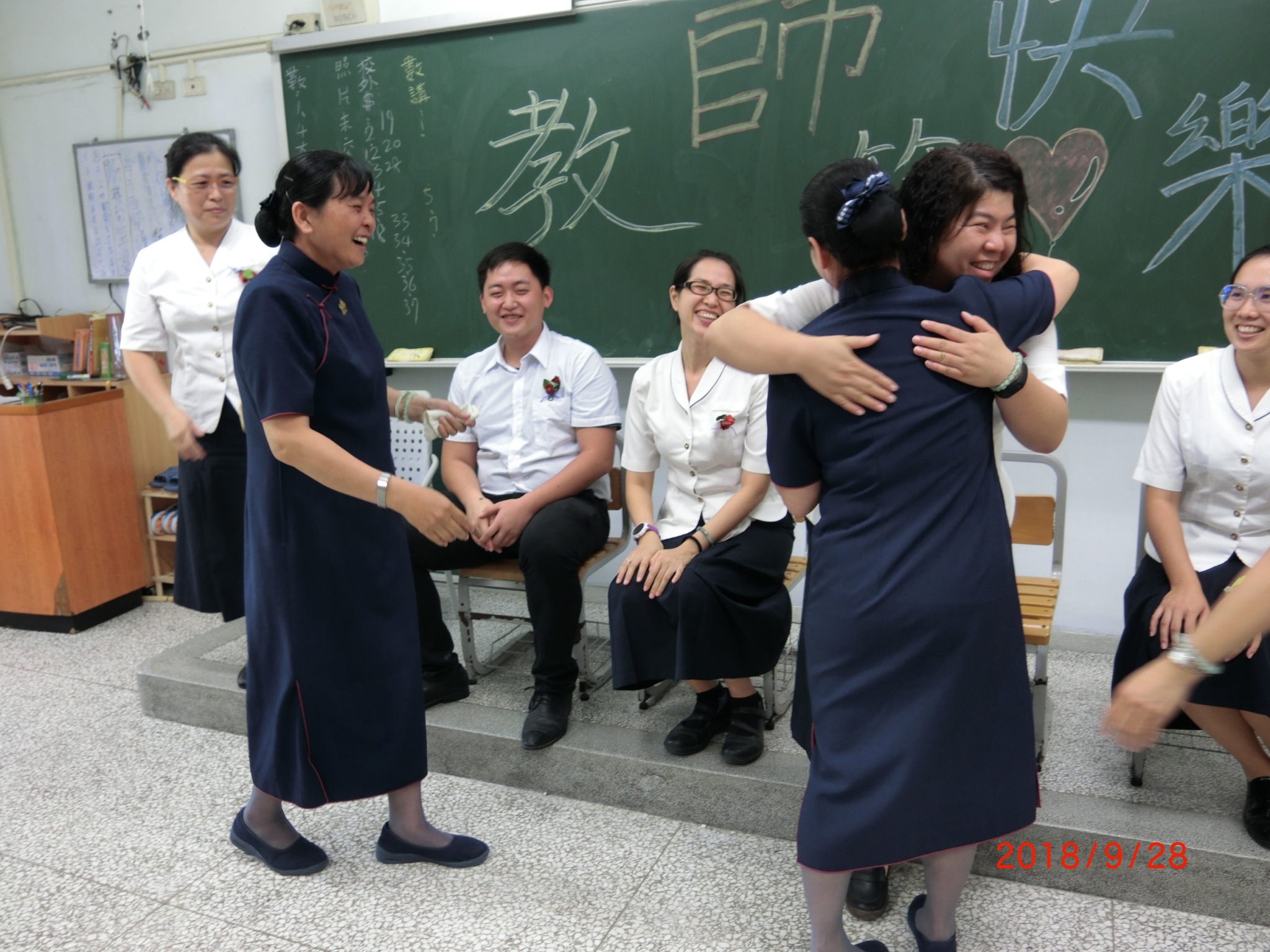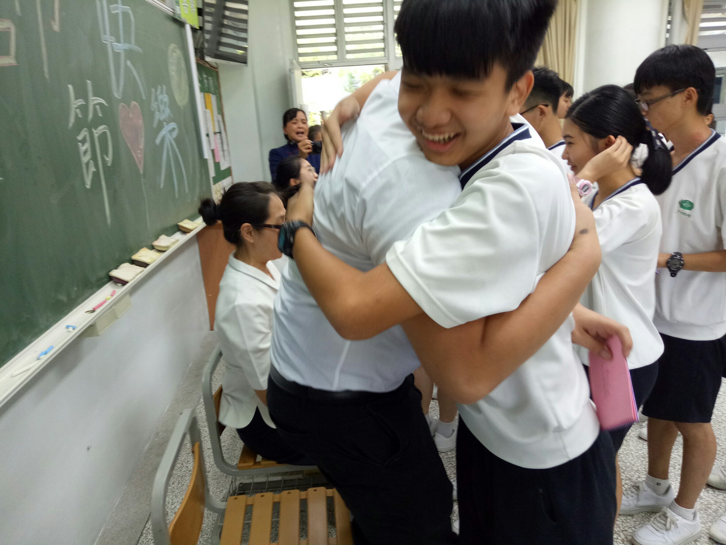 學生們表演手語(感謝),媽媽們與學生一起表演手語(因為你因為我)。學生寫卡片感恩在場的老師,學生擁抱老師好溫馨得畫面,懿德媽媽們不知如何感恩老師,也寫卡片感恩老師們的辛苦(幸福) ,老師與懿德媽媽深情的擁抱。