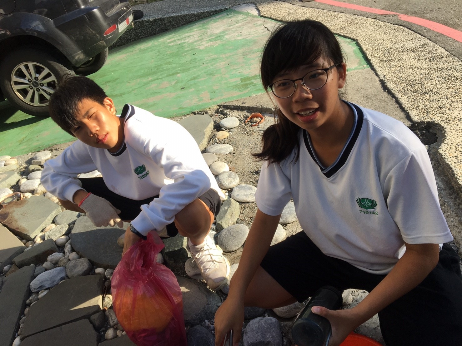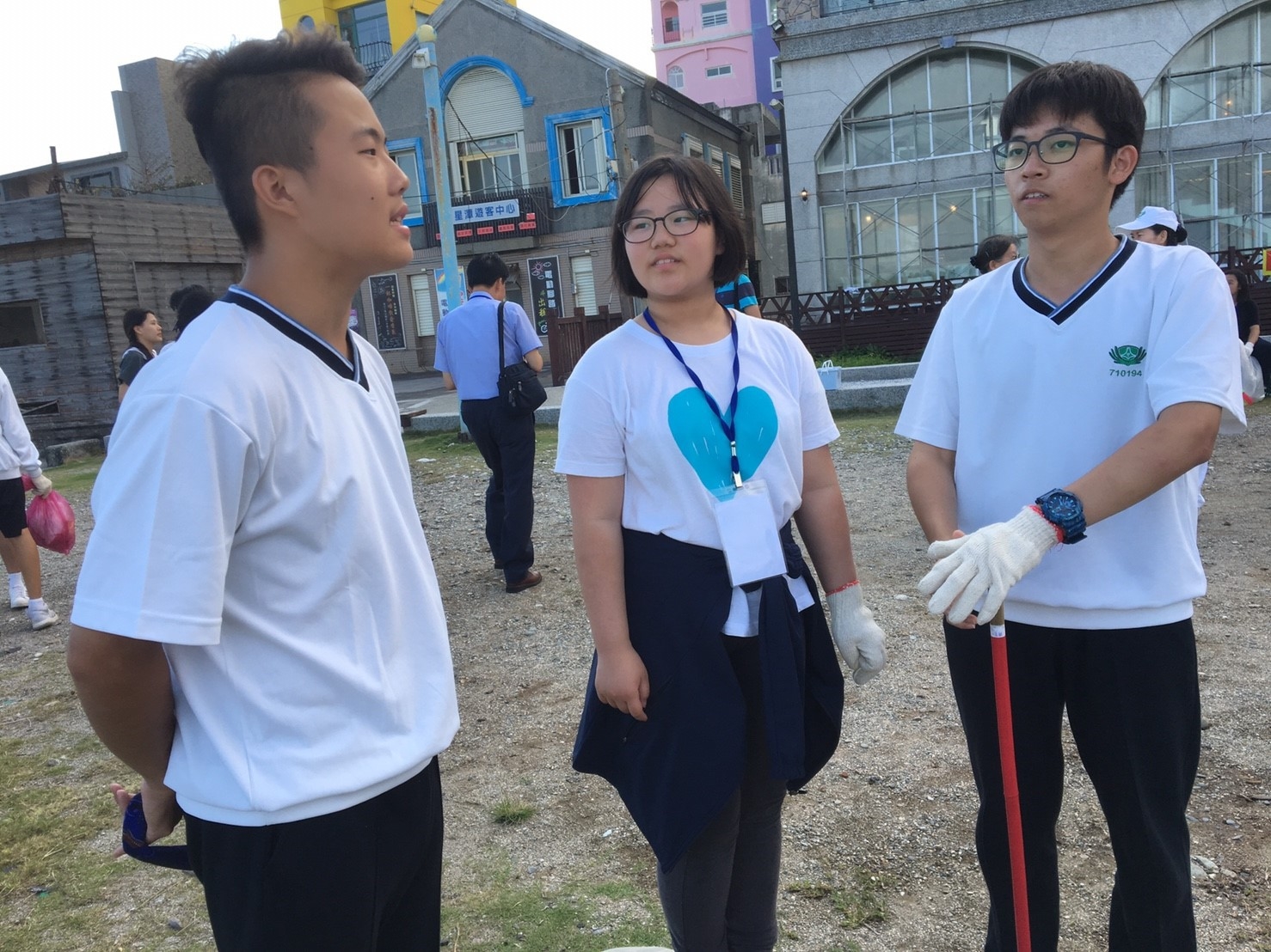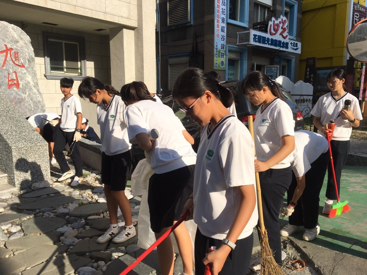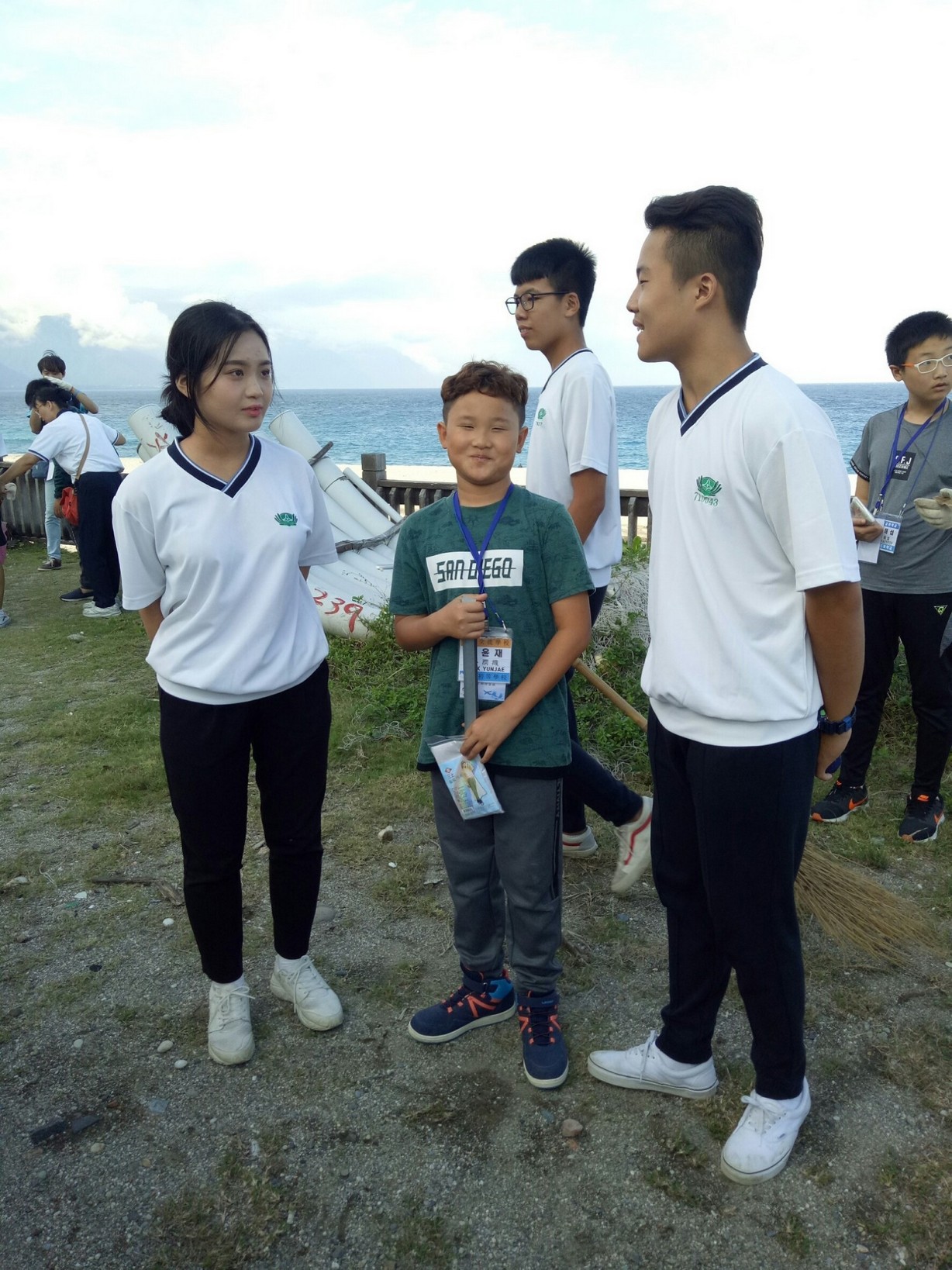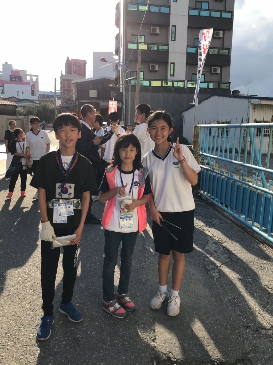 家聚完後,手護洄瀾一九久久,我們班是安排打掃七星潭旅遊服務中心周邊的環境,每個孩子用心打掃,讓七星潭的環境更亮麗。更幸運的是我們班與這次來的韓生一起打掃,一對一孩子帶領一起打掃,班上有二位韓國學生剛好懂得韓語,是金蕙瀞與李制奎兩位同學,承勳承擔我們班上的小記者,要採訪這次韓生一起打掃的心得,看他們真的有板有眼不輸專業的記者,一位訪問一位翻譯,孩子發揮她們的專長。