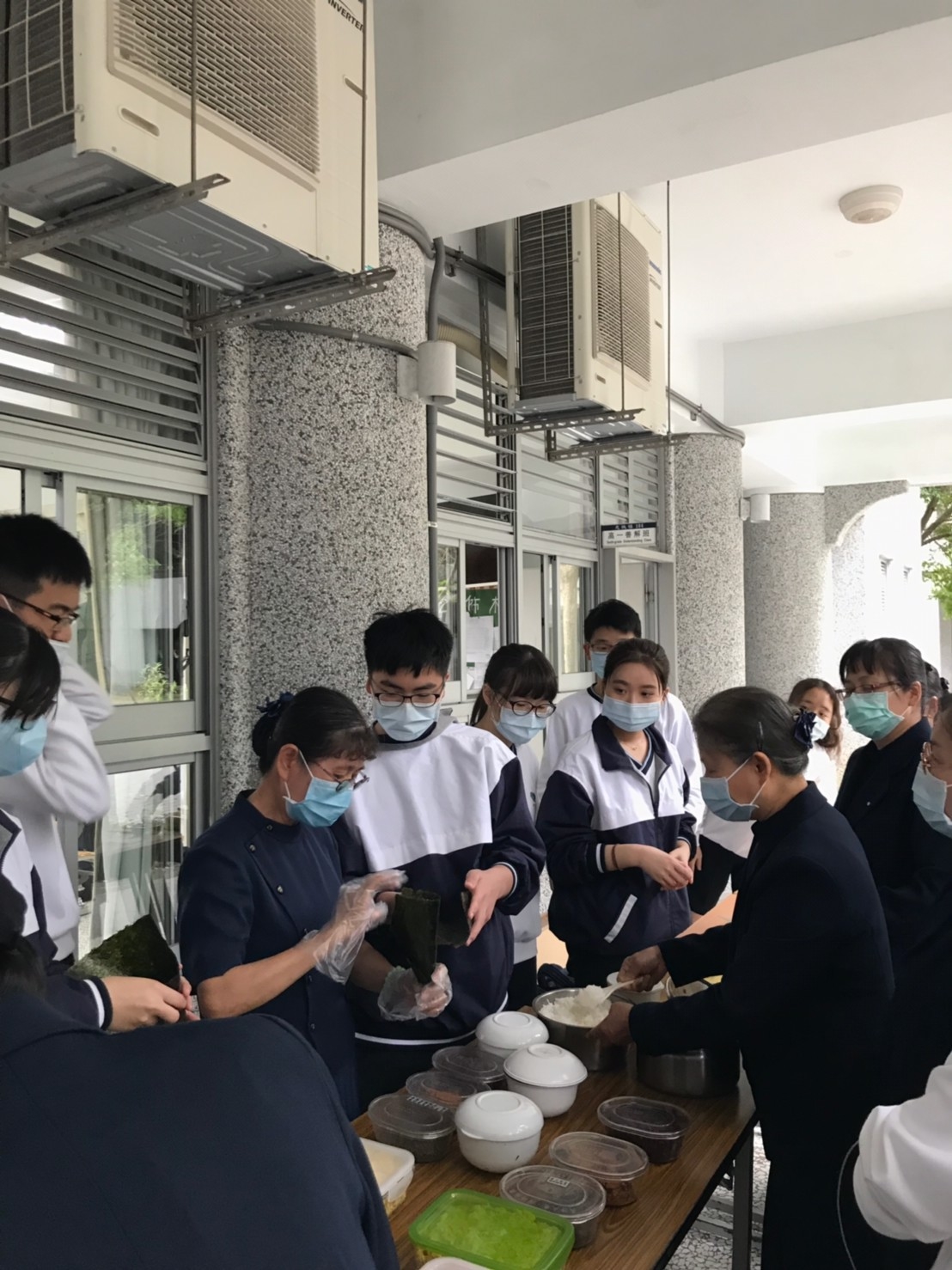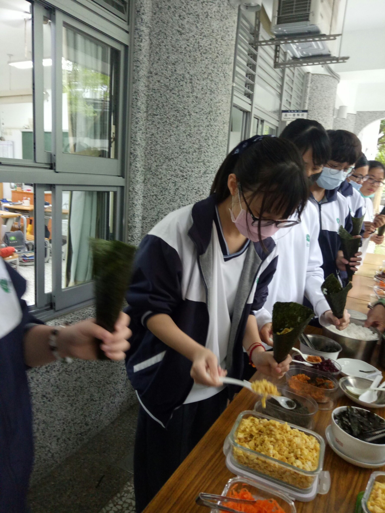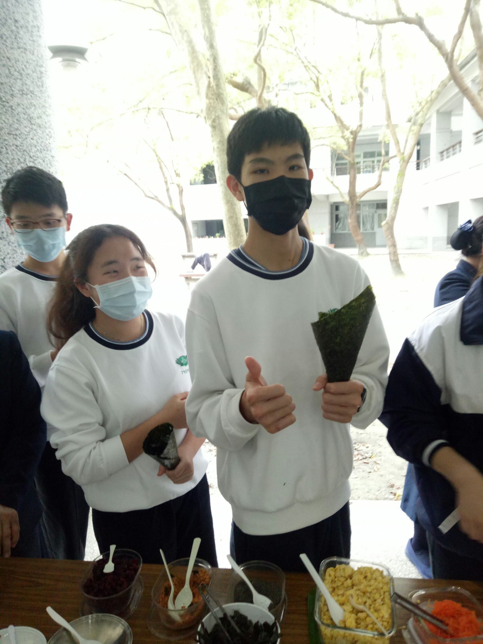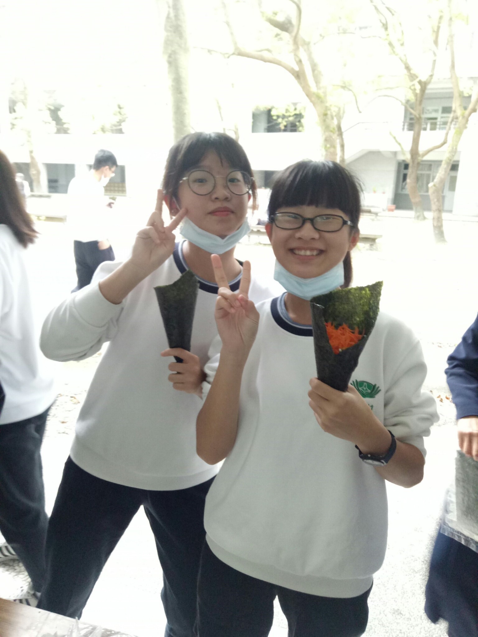 今天班上二位孩子因流感而被隔離,全班師生包括懿德媽媽進教室也需帶上口罩。今天懿德媽媽準備的點心是海苔手