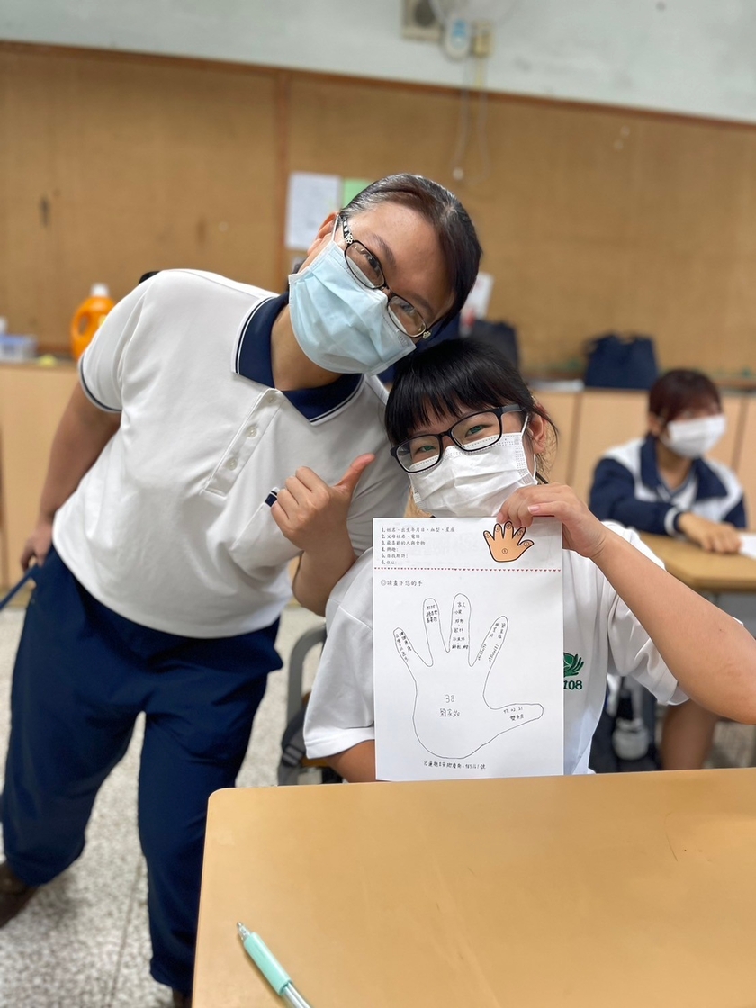 與善解班的孩子們相認後,我們隨即入班,祖佩媽媽以有趣的手掌五指圖為媒介工具,帶動孩子們在不同手指的位置上,分別簡介寫下自己的「星座、最喜歡的食物、最喜歡做的事、最大的願望、最愛的家人」等5項資料,會後,祖佩媽媽還超級用心的將孩子們的五指圖,分家族建立成電子檔,方便日後大家來認識孩子與家訪使用。