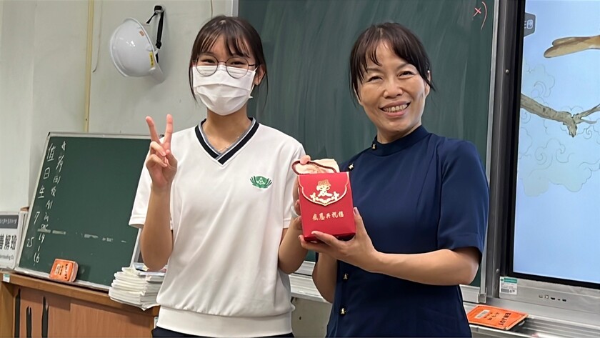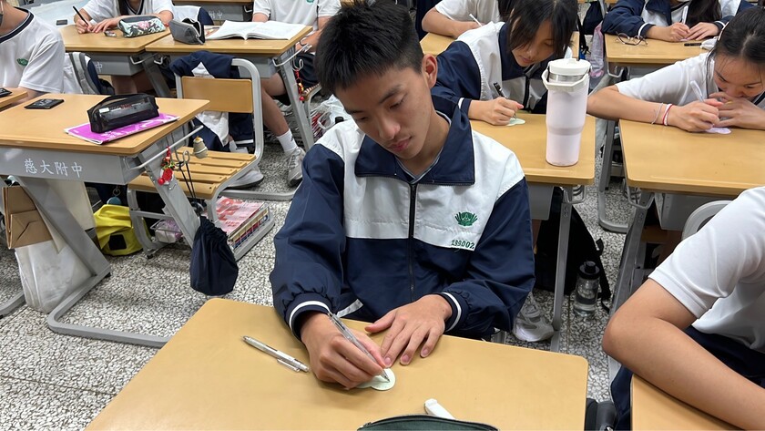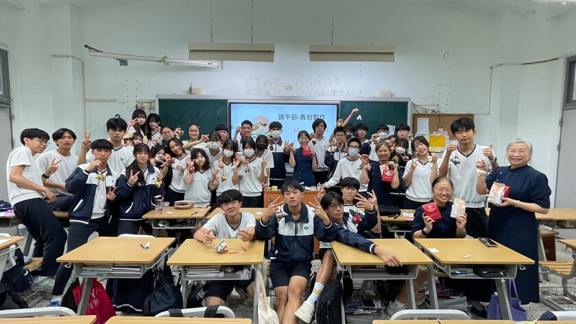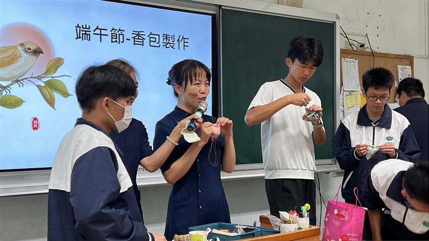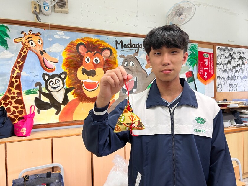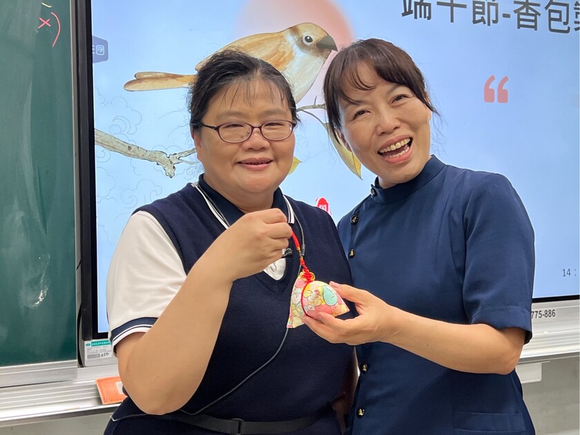 美鳳媽媽為孩子們說明,炎炎夏日,萬物復甦,要護孩子安全,以前的媽媽們會準備避五毒的香包,給孩子掛在身上,而端午包粽子的由來,雖然與屈原有關,但端午過後,多半是7月考試季,媽媽親手包粽子,取其諧音祝福,就是希望莘莘學子能「包中」自己的心願學校!