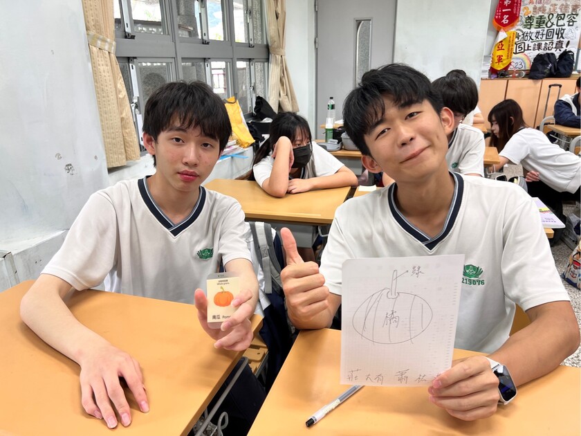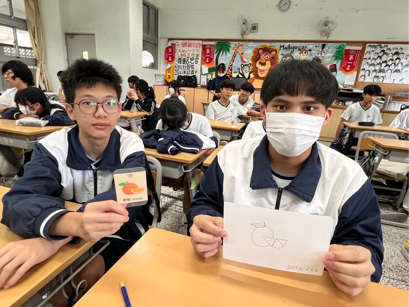 今天的活動在「你說我畫」中展開,學生分兩組,一個人試著描述出手中素食卡片上的圖案,一個人就負責畫出來,再看看是不是能準確描繪出來食物的外觀。