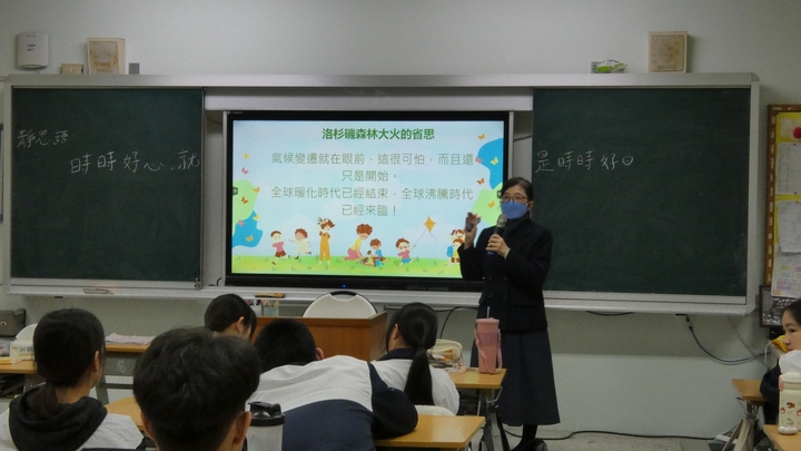 為主題的活動,向學生傳遞環保知識,溫室效應造成全球氣候變遷,極端氣候頻傳,如熱浪、乾旱、洪災、森林大火等,如年初美國落杉機野火,造成很多家庭一夕之間家園全毀,還有今年台南的地震等,天災造成的無常之苦,值得大家警惕,所以我們要從自身節能減碳做起,落實於食、衣、住、行、育、樂、購等生活中做起,減緩溫室效應是我們愛護地球,人類免於災難的當務之急!且藉簡報中看到慈濟的愛一直都在,希望同學能把握因緣學習付出,幫助需要幫助的人,成為助人的那道光,帶領別人走過生命的幽谷!培養他們愛護地球的意識。類似的環保教育活動在其他學校也有開展,例如:十字口訣,