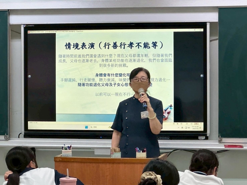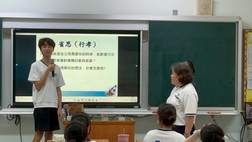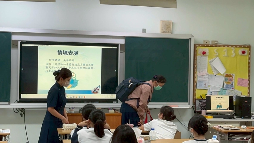 情境表演行善篇,珍瑩媽媽、美華媽媽演出母親十月懷胎的辛苦與造成身體的不便,需要兒女照顧,讓學生去體會媽媽辛苦。
