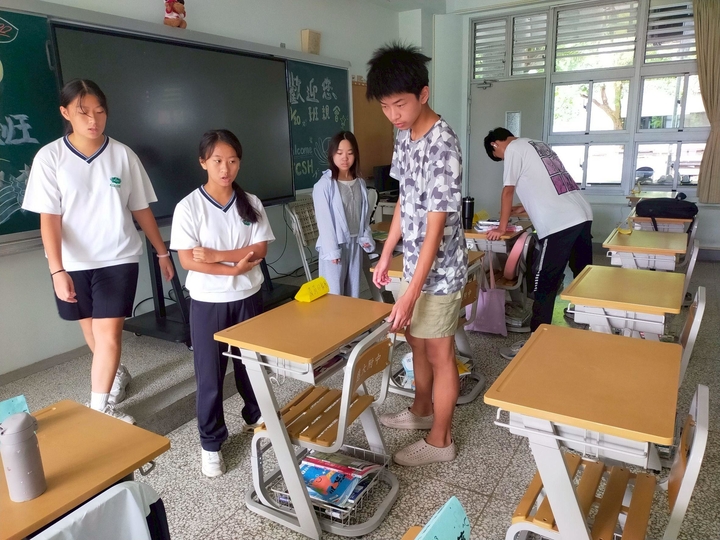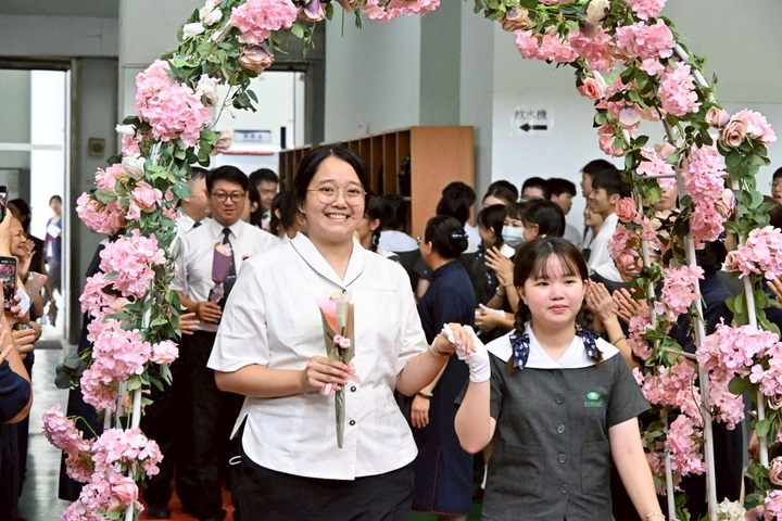 班導美霞老師和迎賓生一起走進會場,兩人臉上都綻放著甜甜的笑容,乍看之下相似度竟高達90%,令人莞爾。