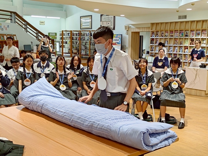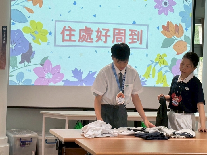 為了讓活動流暢進行,慈懿爸媽利用傍晚時間,熟悉校園環境,大家分工在體驗教室裡佈置教案工具、生活物品,完成場地佈置,加緊把握時間排練明日活動的流程。分站場佈後,懿德媽媽們前往女生宿舍,一出電梯從走廊到寢室間,彌漫著沐浴乳的香氣,撲鼻而來有回家的感覺,聽到孩子的歡笑聲,孩子們開心迎接懿德媽媽到來。本班女學生寢室分在兩間,空間設計好人性,寢室間可以互通,不用走獨立大門。在移動中,媽媽們關心著每位孩子宿舍環境、寢室配置、盥洗設備,貼心照顧好每位住宿生的心情。