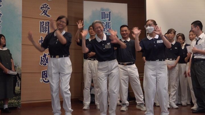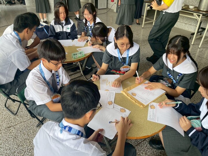清晨返回校園,親子相見歡時間終於到囉!高中部活動地點在天文館,大家齊聚一堂,經過巧思安排,孩子們坐台下,爸媽們上台表演手語,讓孩子們找到對應的班級爸媽。本班指定手語是「365天天靜思語」,在爸媽們上台表演前,部分媽媽臨時被指派到其他地方表演手語。在人手不足情況下,爸媽們靈機一動即興表演,與踩排的內容完全不一樣,但大愛班學生代表~~訡芸仍然跑來台前跟我們相認,讓爸媽們好感動,「醬厲害!一眼就被看出來。」接著,班級孩子們分成3個家族,由3~4位慈懿爸媽協助孩子完成圓桌上的五指圖製作。藉由五指圖可讓爸媽們更瞭解每位孩子的家庭狀況、興趣、未來生活志向等。透過短暫相見歡時間,爸媽們也能進一步與孩子接觸,彼此之間有多一層的認識。