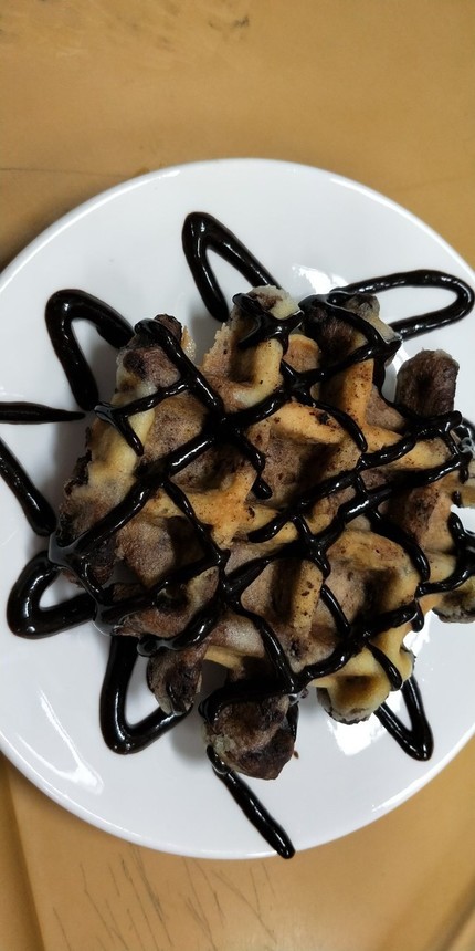 3.以鬆餅作基底,抹上巧克力醬