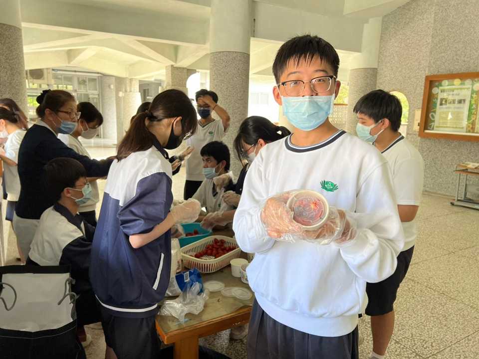 四、男同學負責切小番茄及裝盒,女同學負責鑲蜜餞,短時間內合力完成,很開心!
