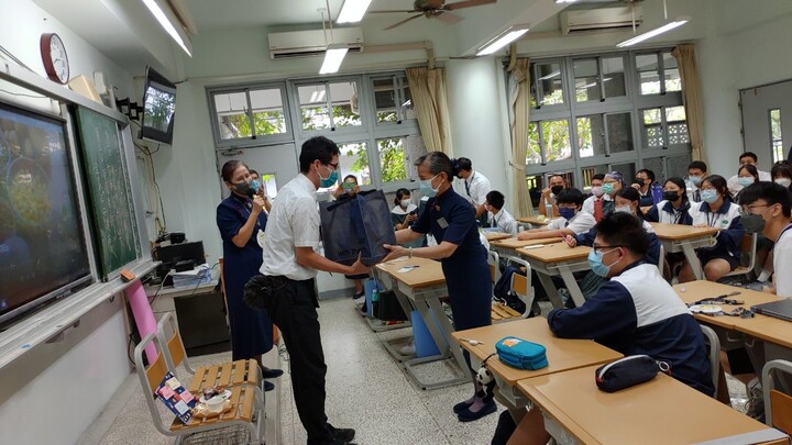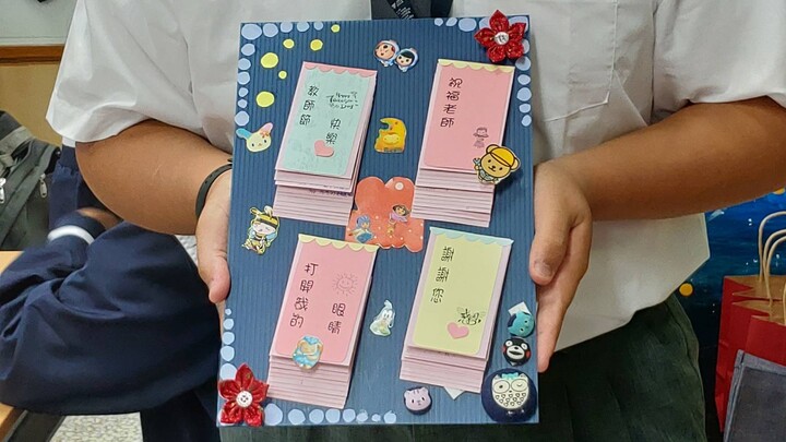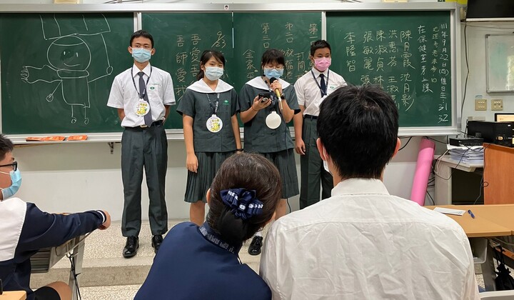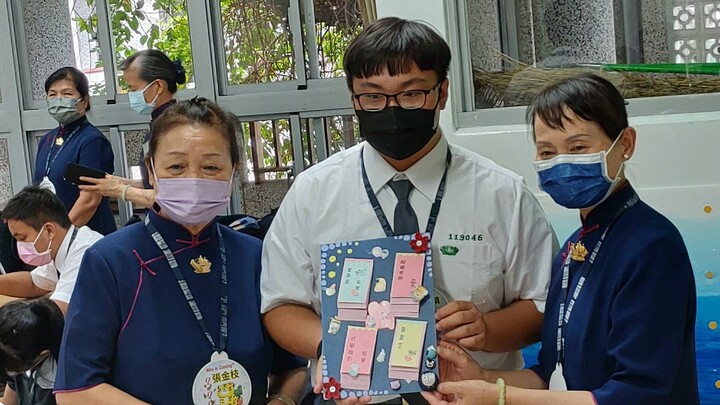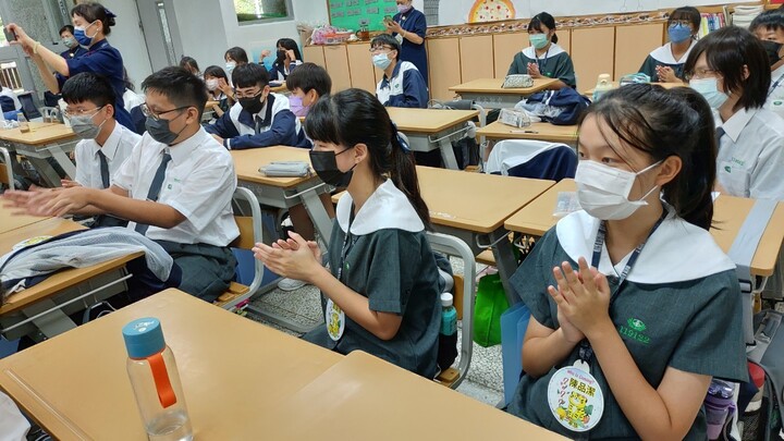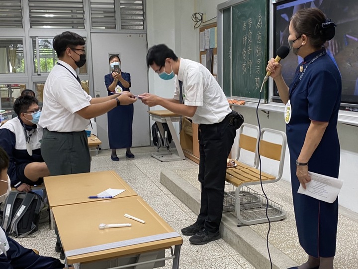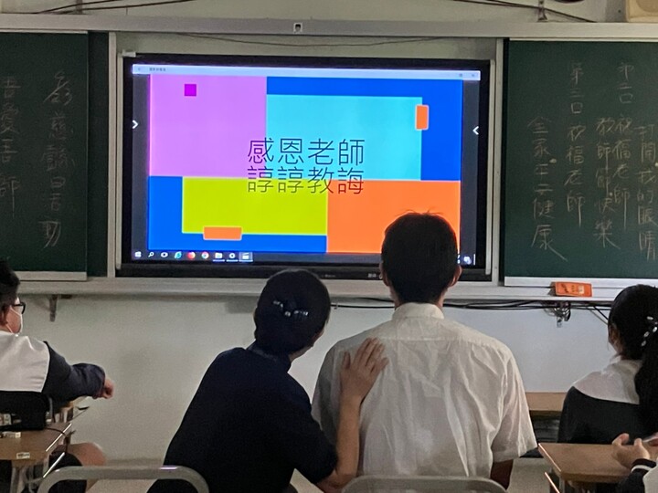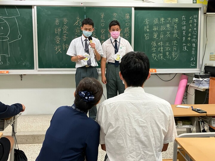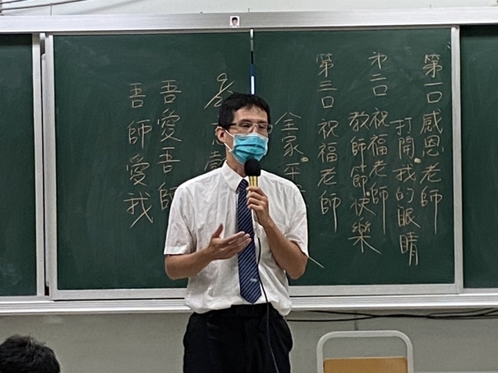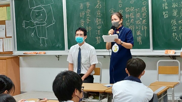 (10) 奉茶結束後,邀請立偉老師給同學們勉勵。並由月霞媽媽代表慈懿會致贈敬師禮(大愛感恩科技背包)給老師,大禎班長也將同學們寫好的敬師小卡貼在方形美編板上獻給老師,感恩老師諄諄教誨之辛勞。