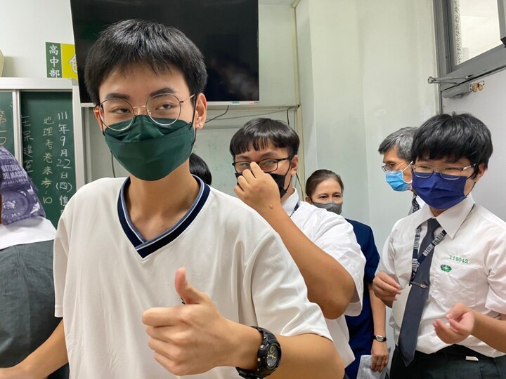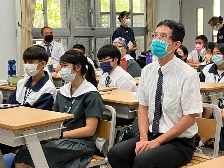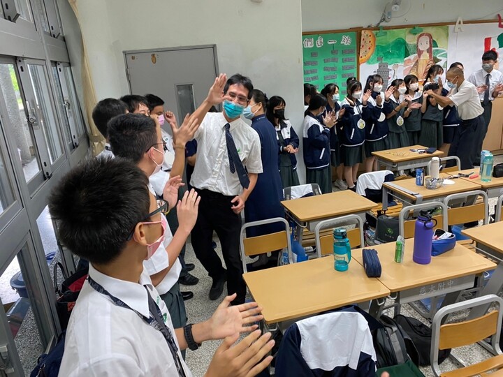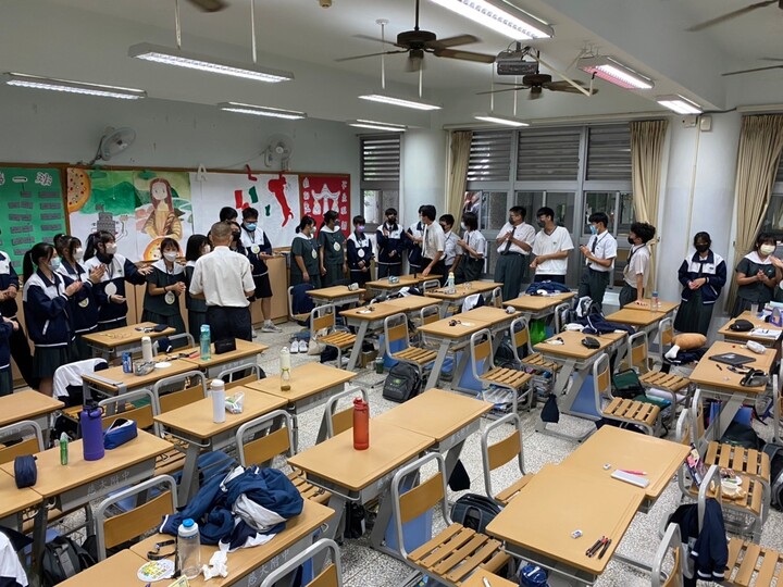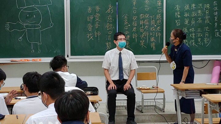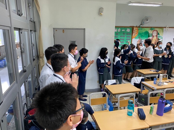 (5) 彩排結束後(約兩點),大禎班長至辦公室邀請老師過來,僅邀請到立偉老師,他是我們今天的最佳男主角。進教室時同學們報以熱烈掌聲。