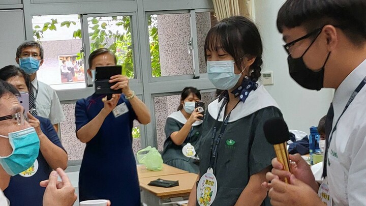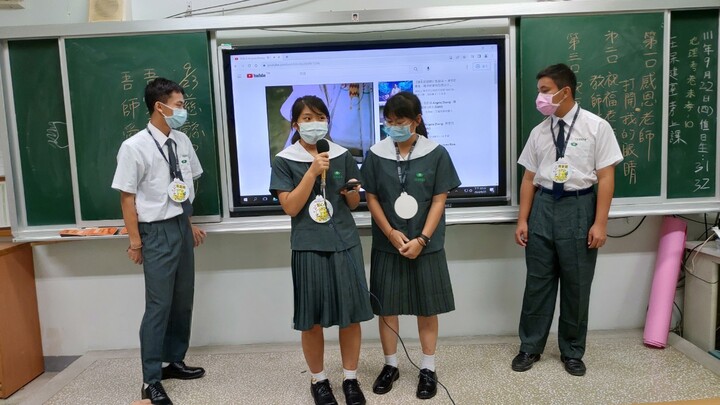 (4) 司儀請發表敬師感言的四位同學(男女生各兩位)出場,說出他們對老師的感恩與祝福;也請奉茶的兩位同學在教室後準備,他們從懿德媽媽的手,接過三好茶,緩緩走向前,獻給最敬愛的老師。