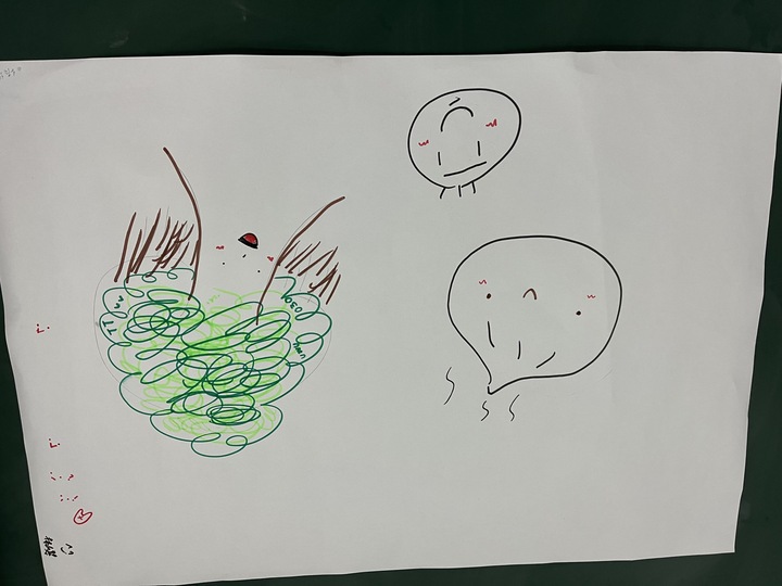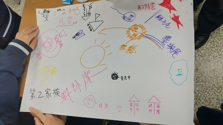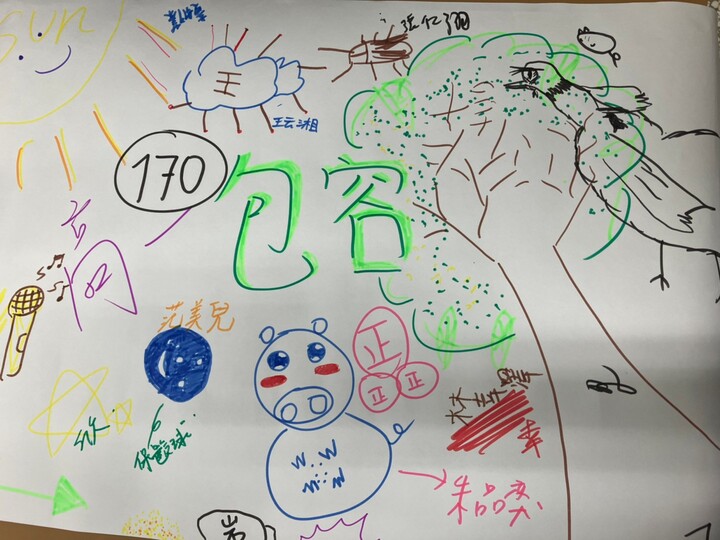 (3) 接下來「包容班風」單元,敏麗媽說我們是包容班,正好將「包容」當作我們的班風,凡事善解與包容,一定會有好人緣。敏麗媽發給每家族1張壁報紙,請他們畫出心目中的「包容」。畫完再請每一家族派代表說明他們的圖案代表甚麼。第二家族廷沂同學就畫一把傘,代表她願意為需要的人遮風避雨。同學們很有想像力,短時間畫出生動活潑的圖案,真不簡單。
