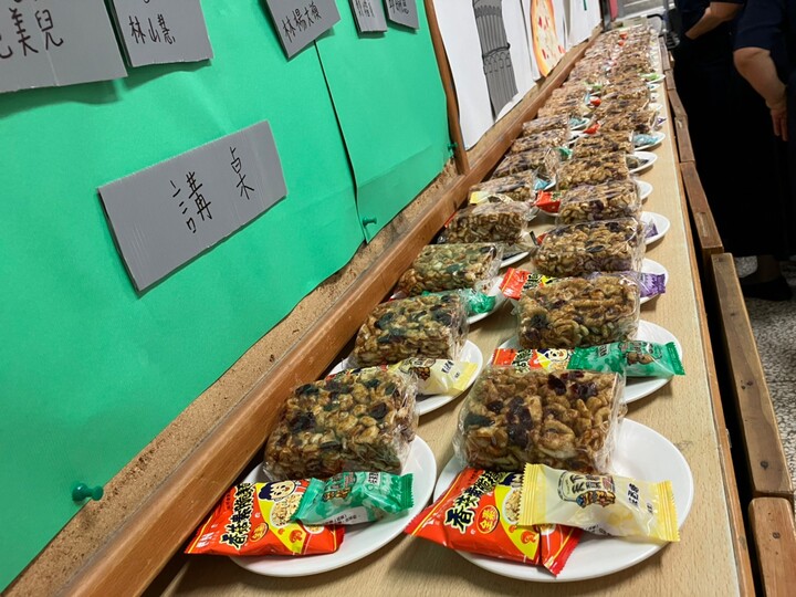 (5) 為了節省時間,播放影片的同時也讓同學們吃點心,爸媽們準備了沙其馬、素脆麵和金門貢糖,還有紅茶和可可,請孩子們喝下午茶。當然防疫很重要,吃點心前,敏麗媽提醒同學們將透明隔板架好,保護自己也保護別人。