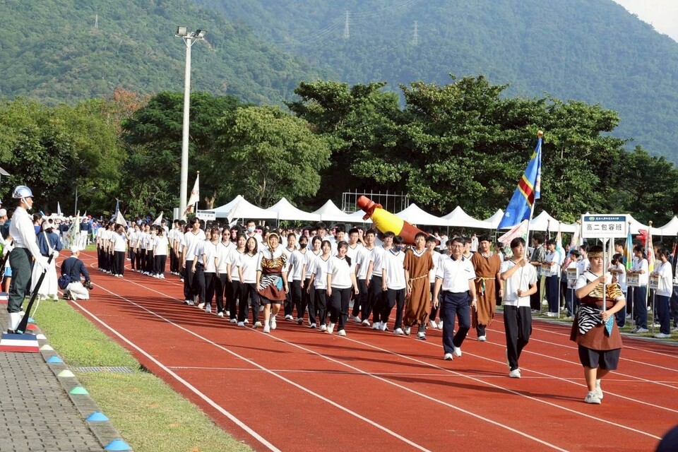 運動場上的典禮台,高掛著「慈中25、大愛有才、美善傳承、希望未來」今年校慶運 動會主題,典禮開始,首先旗隊和校旗進場,挺拔姿態,展現出莊嚴威儀。接續是 運動員進場,各班帶著不同國家文化創意的表演道具進場,猶如進入多元的世界之旅。
