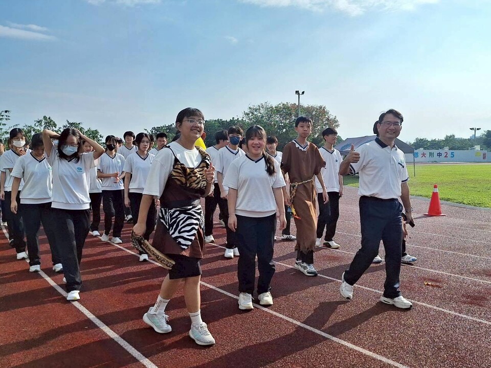 我們班(高二包容)代表剛果,同學身穿條紋服裝,展現了自然與野性的力量。班上孩子-秉益是今年場上的標兵,英姿挺拔,有別日常,暄蓉是長跑健將,獲得多項獎牌(個人100公尺第一名),大隊接力、拔河皆榮獲高二第三名。