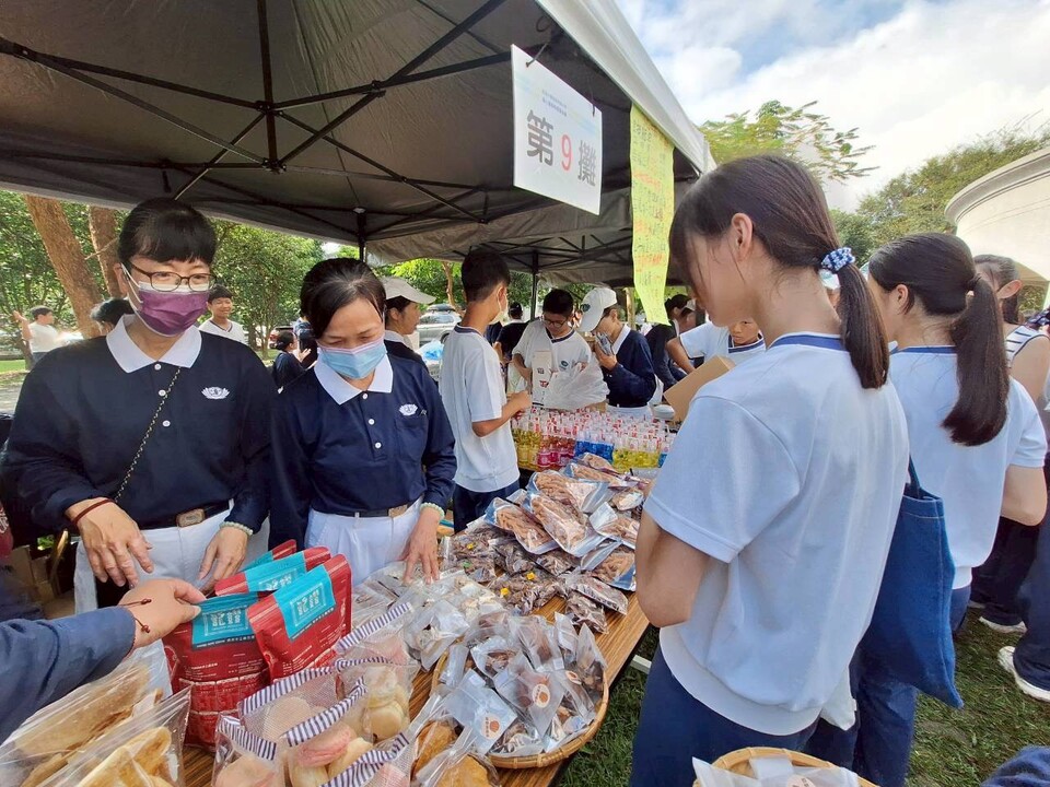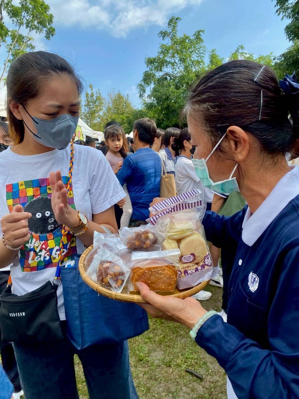 另一區景象是,看到懿德爸爸媽媽推著今天所準備的義賣商品,往定點出發,這次我們義賣商品,有每年熱銷商品〜堅果、桂圓饅頭、燒餅、雪Q餅、杏仁酥、馬卡龍、麻花捲、堅果塔,加上今年新商品果仁及瑪德蓮。我們班上有一位超級銷售-彩虹媽媽,帶著我們的商品,穿梭在人群中,介紹著師姊用愛心做出的商品,也讓家長們清楚知道今天園遊會的所得,將全數捐出,幫助在光復中受苦的鄉親,告訴大家今天不僅是學校運動會,更是一場充滿愛與關懷的行動。讓學生及家長們了解,因為自己所付出的努力能幫助別人,看著個人臉上綻放出最真誠的笑容。在玩樂當中還可以做公益,展現出「以愛行善」的慈濟精神。