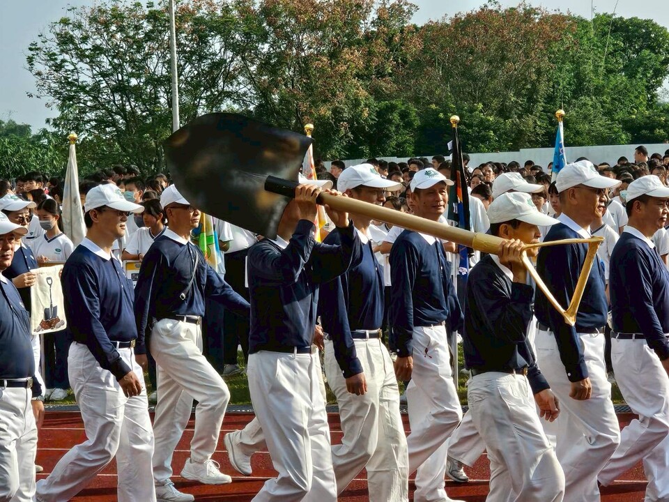 慈誠懿德爸爸媽媽們以「鏟子超人」詮釋慈濟人無私奉獻、勇於付出的精神進場。