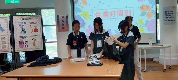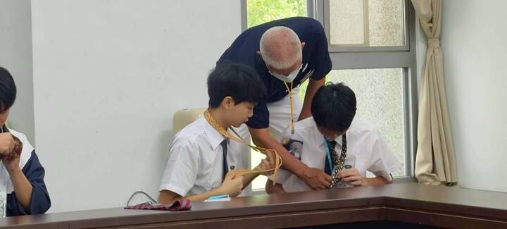 接下來是小組闖關活動,將慈濟人的行住坐臥透由實際操作傳達給孩子。 吃飯怎麼拿碗,怎麼放餐具才不會影響別人; 人與人之間的舒適距離是多少? 要怎麼整理寢室,要怎麼疊被子; 女生要如何正確地綁辮子,男生要怎麼打好領帶等等,無一不是用最生活化的方式傳達慈濟人文。