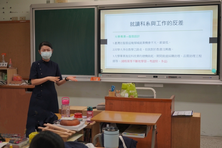 大學習得專業為服裝設計,但畢業後卻進入科技業,極端的反差,一度讓素貞媽媽覺得自己當初選錯科系,所學無用,但在GOVID-19疫情席捲時,因為自身的專業,為全校老師製作400多個布口罩應急,讓她覺得有這項專業可以幫助別人真好。媽媽告訴同學們,不要怕大學選錯科系,但一定要培養自己的第二專長,有朝一日就能派上用場。