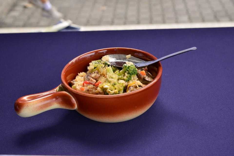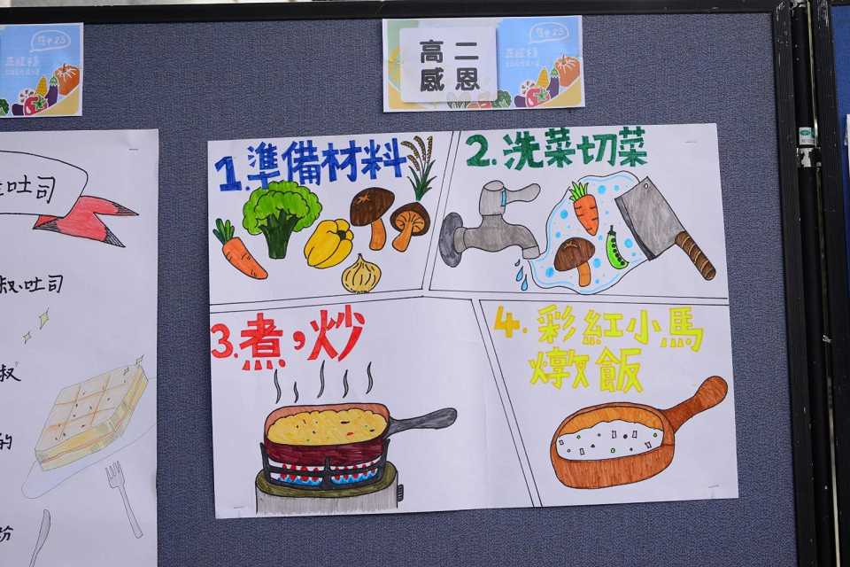 這次的創意料理比賽本班由陳怡臻、沈瓴聿、朱庭嬅和夏品豪四位代表參賽及周永瑞爸爸陪伴,推出的作品彩虹小馬燉飯,榮獲本次比賽第一名除了色香味俱全之外,對於採用在地食材的介紹也深獲評審的認可;以下是介紹內容”評審你好:我們這道菜的名稱叫彩虹小馬燉飯,這道菜的彩虹是我們的菜青椒有著紅黃,花椰菜是綠色而香菇有咖啡色和白色,而這些菜為了貼近我們大會的需求「在地」,所以都是今天才市場新鮮購買的,而我們的燉飯,是來自在地的”吉安米”。