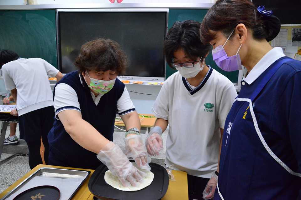第一家族由珮甄領軍烤餅皮,其他孩子紛紛戴起手套分別捲餅加料,第二家族聖弘捲起袖子加入冠傑、亨縉、家銨在旁用心的捲餅女生則在旁加餅料,時而太多造成爆料餅,時而太少變得瘦小餅, 第三家族由祐安掌鍋俊、芩柏、愷似乎較有經驗製作品項也較均勻,還有一旁的又晨湘淳默默的製作捲餅,美燕老師也一同加入手作的行列,一時之間全班都熱烈起來~