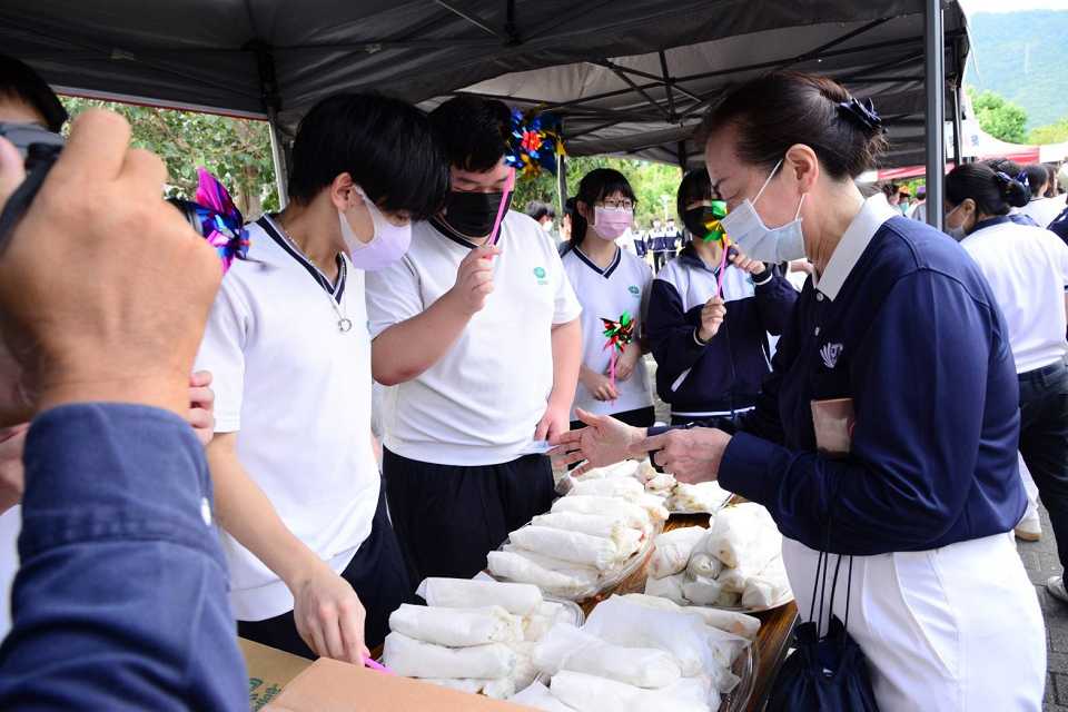 由孩子們臨時製作的海報高掛在攤位上,除了烤餅之外秋玉媽媽也拿出雨傘來義賣,聖宏、柏愷拿出小風車當作道具熱情招攬,義賣過程中讓孩子們體會到原來募款原來是一件愉快的事。
