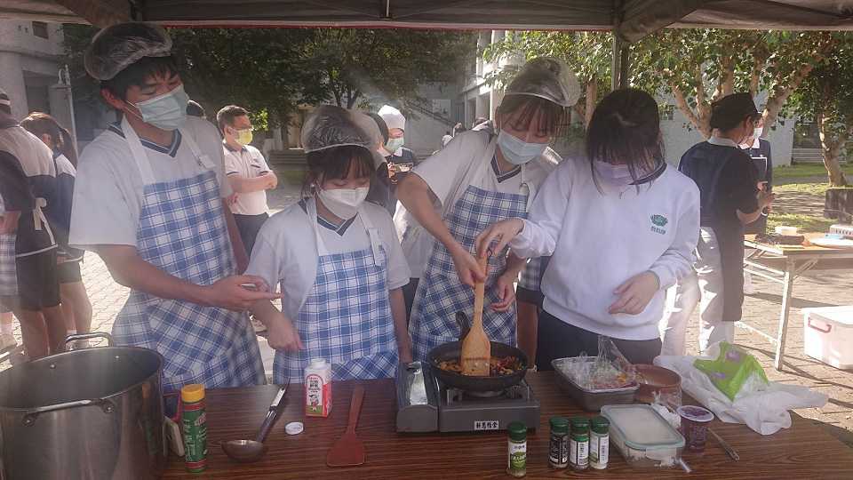 當天首先在教室外迴廊玟靜、宜芳、柏菖一起來把馬鈴薯泥攪拌及切洗,平均分配材料。