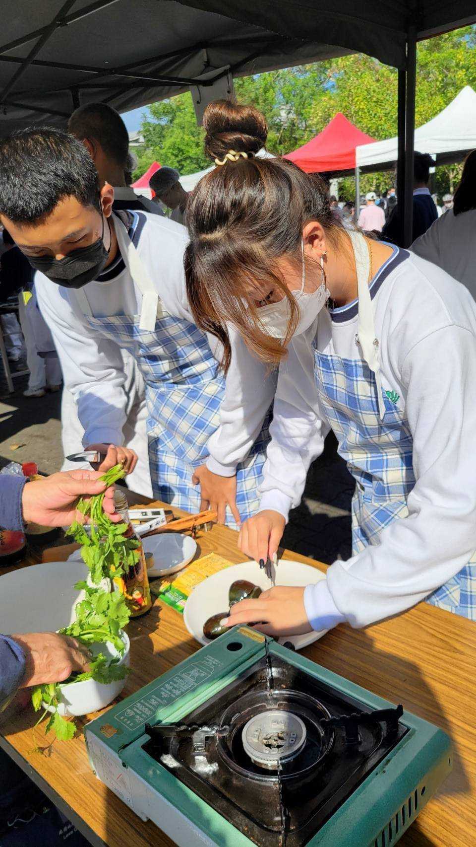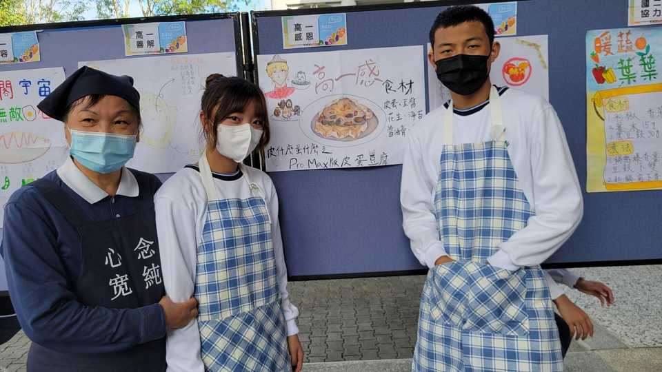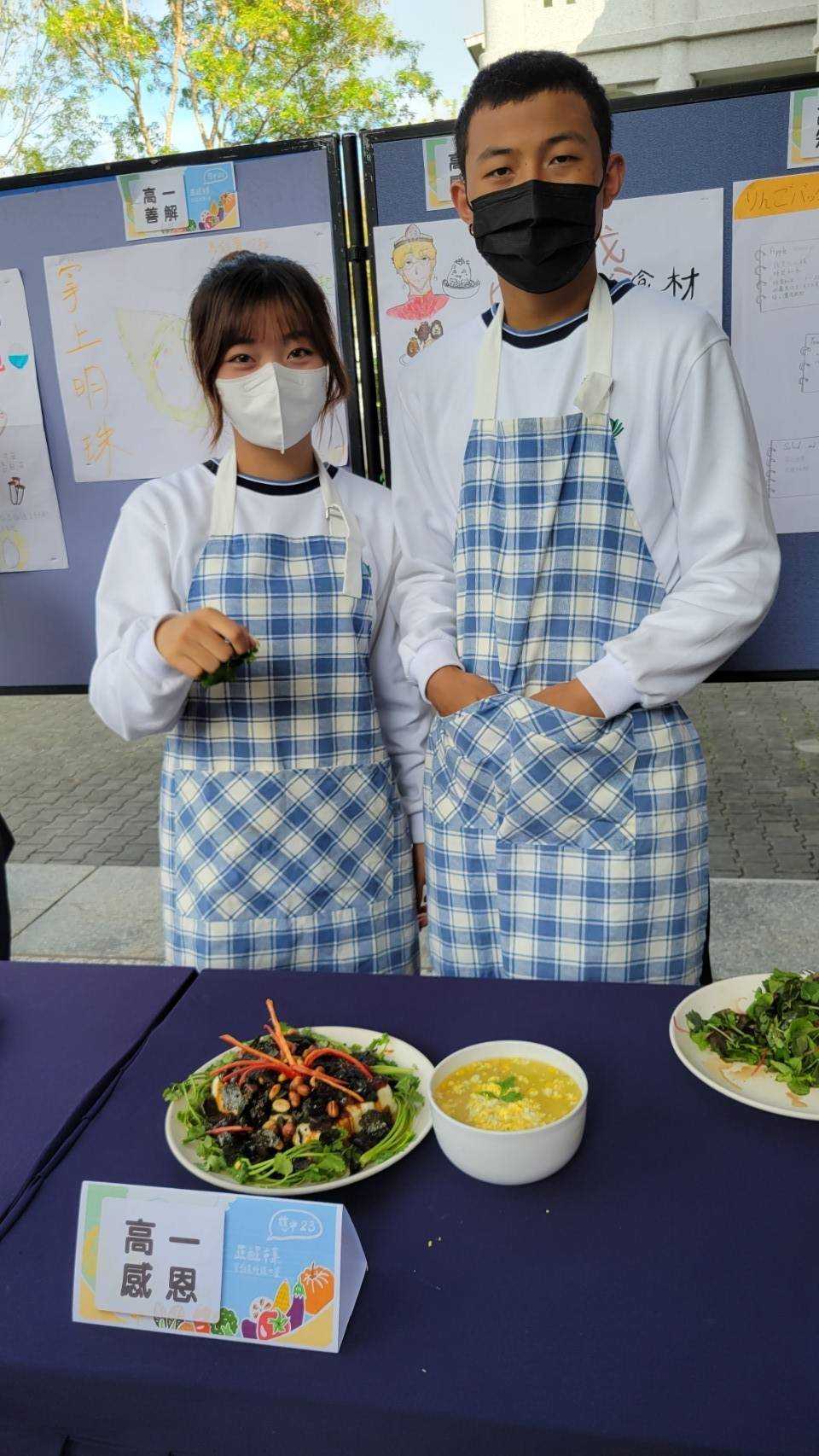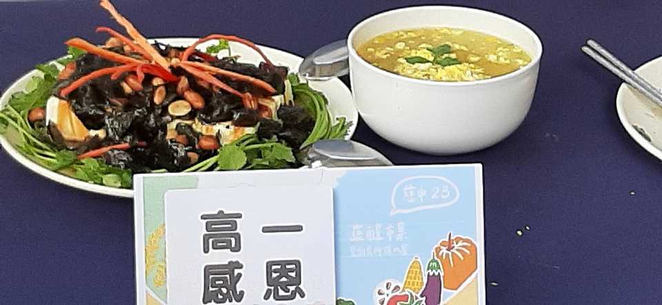 蔬食創意料理比賽由學生韓膳駿、學生黃羽慈、學生羅翔維參賽;創意料理名稱:皮什麼之Pro max版皮蛋豆腐、加玉米湯,皮什麼之Pro max版皮蛋豆腐盤用香菜圍一圈放涼拌豆腐切塊、皮蛋切小塊放豆腐上、淋上少許醬油、淋上少許香菇素蠔、淋上少許香油、撒上花生、撒上海苔碎片,最後用辣椒切花點綴;玉米湯用濃湯包煮好裝碗後再用水煮蛋撥細撒在湯裡最後放上香菜點綴,過程中由程素翠師姊、盧玟樺師姊協助指導完成。