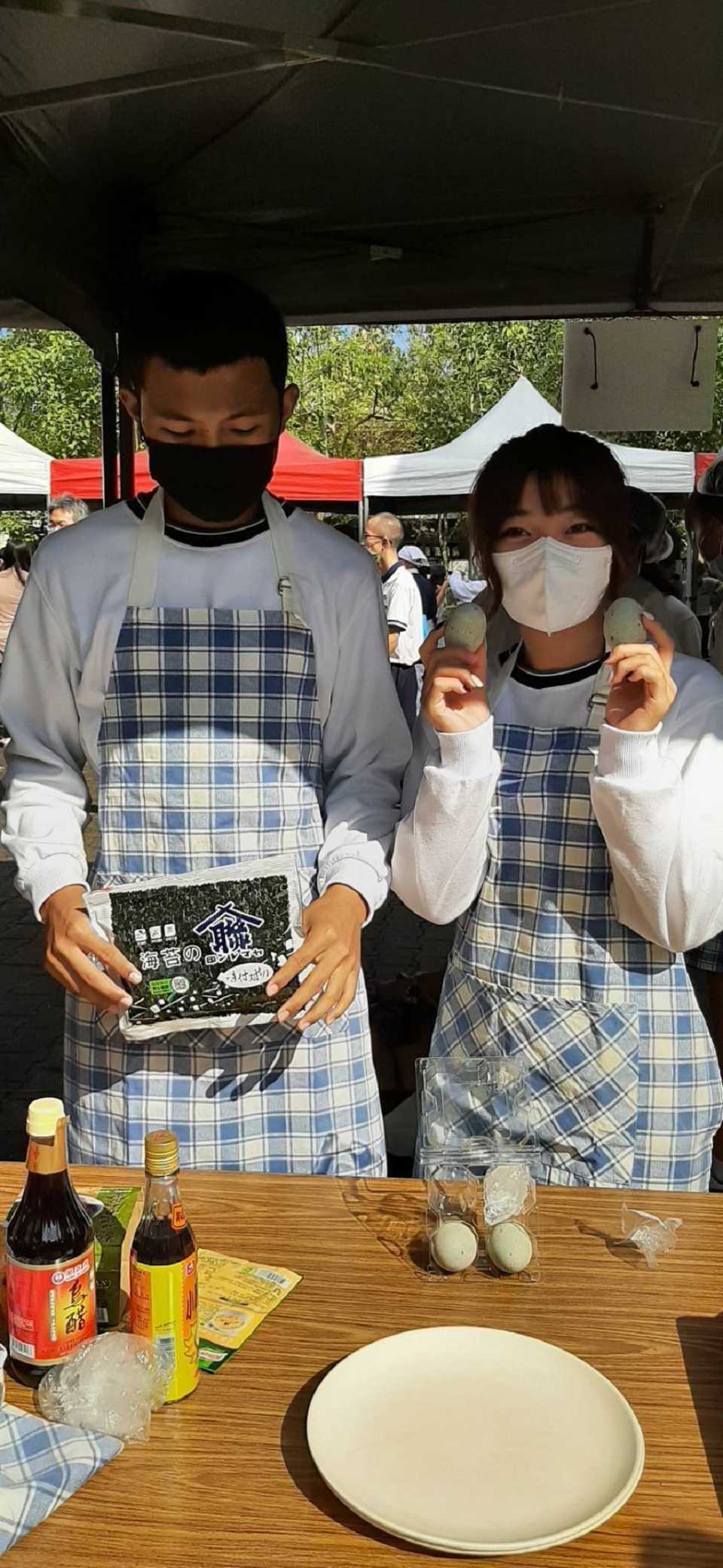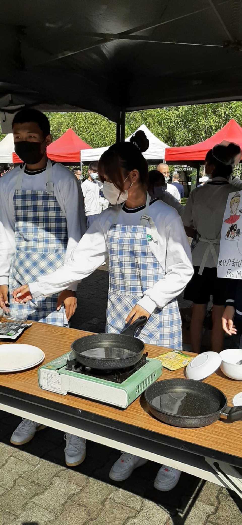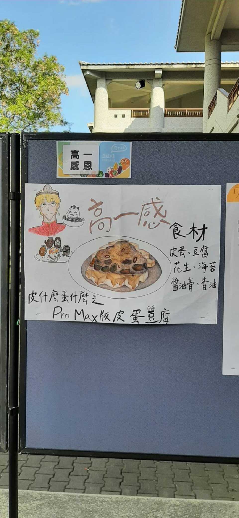 蔬食創意料理比賽由學生韓膳駿、學生黃羽慈、學生羅翔維參賽;創意料理名稱:皮什麼之Pro max版皮蛋豆腐、加玉米湯,皮什麼之Pro max版皮蛋豆腐盤用香菜圍一圈放涼拌豆腐切塊、皮蛋切小塊放豆腐上、淋上少許醬油、淋上少許香菇素蠔、淋上少許香油、撒上花生、撒上海苔碎片,最後用辣椒切花點綴;玉米湯用濃湯包煮好裝碗後再用水煮蛋撥細撒在湯裡最後放上香菜點綴,過程中由程素翠師姊、盧玟樺師姊協助指導完成。