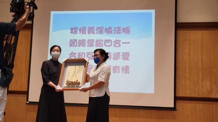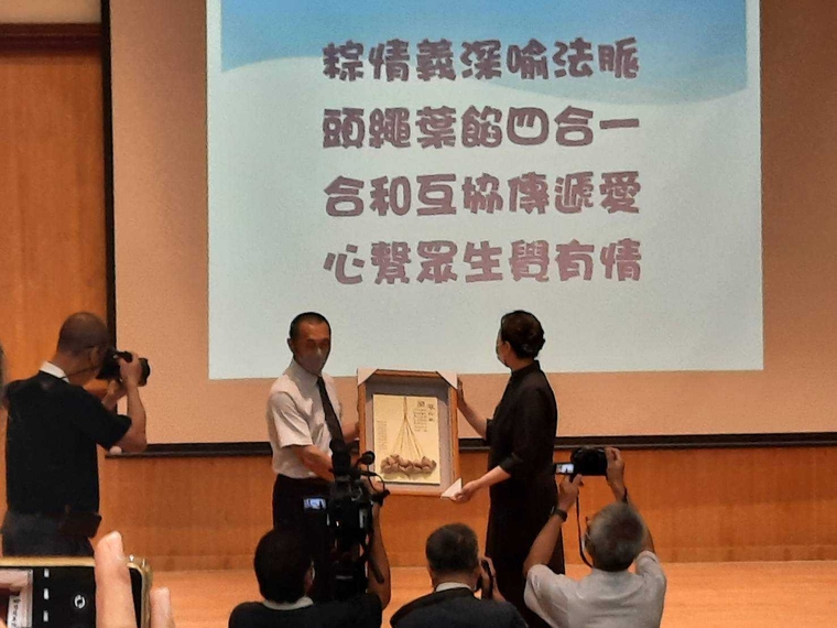 學員長榮忠師兄要慈誠懿德師兄師姐配合和注意事情;也跟全體慈誠懿德爸爸媽媽們結緣手工編織的粽子和成年禮冠誓文;也贈送給李玲惠校長和慈懿合心關懷洪若岑師姊藺草粽串;粽情義深喻法脈,頭繩葉餡四合一:合和互協傳遞愛,心繫眾生覺有情。