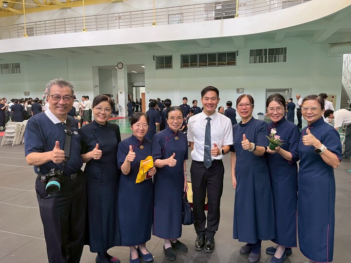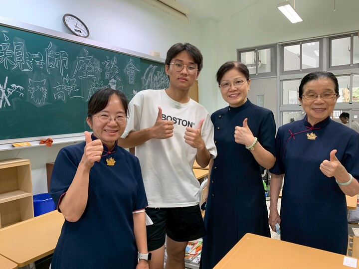 凱莉媽、寶珠媽和憲嬌媽是資深懿德媽媽,稍早之前她們就看到曾待過的第十九屆畢業生楊子慶,會後他剛好留下來,大家歡喜合影。