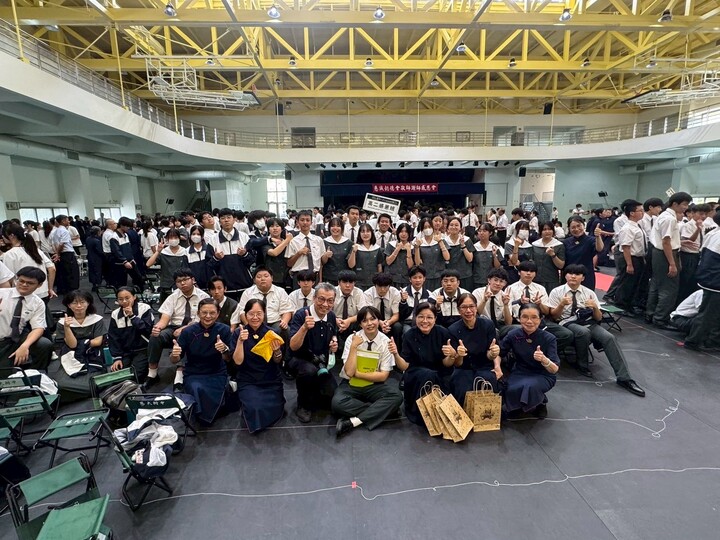午齋後,大家快速移動到慈濟大學介仁校區體育館,依據事前的共作分配各就各位。除了閔輝爸、惠玲媽、憲嬌媽和宥忻媽要延續昨天的任務外,其他人負責內場引導,連發爸並將代表班級「以禮相贈」。