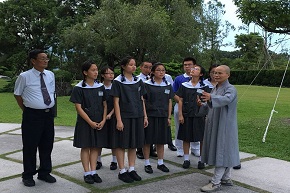 合心總幹事若岑媽陪同藍毗尼國際學校老師們步入會場,受到全校師生熱烈歡迎。